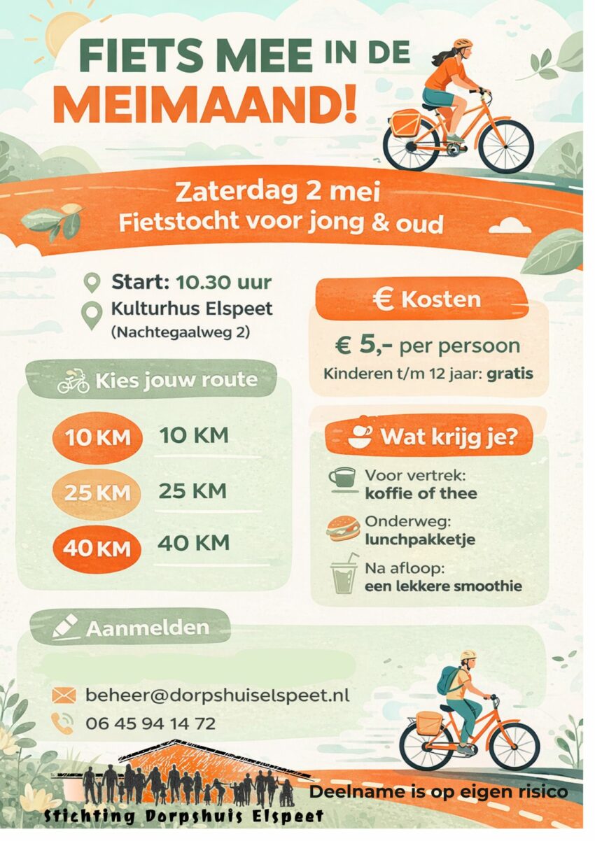 ELSPEET – Op zaterdag 2 mei wordt er in Elspeet een gezellige en sportieve fietstocht georganiseerd voor jong en oud.…