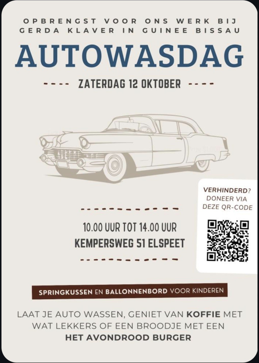 ELSPEET – Laat je auto wassen, geniet van koffie met wat lekkers of een broodje met een avondrood burger. Bekijk de flyer voor alle informatie. Opbrengst voor het werk in Guinee Bissau bij Gerda Klaver.
