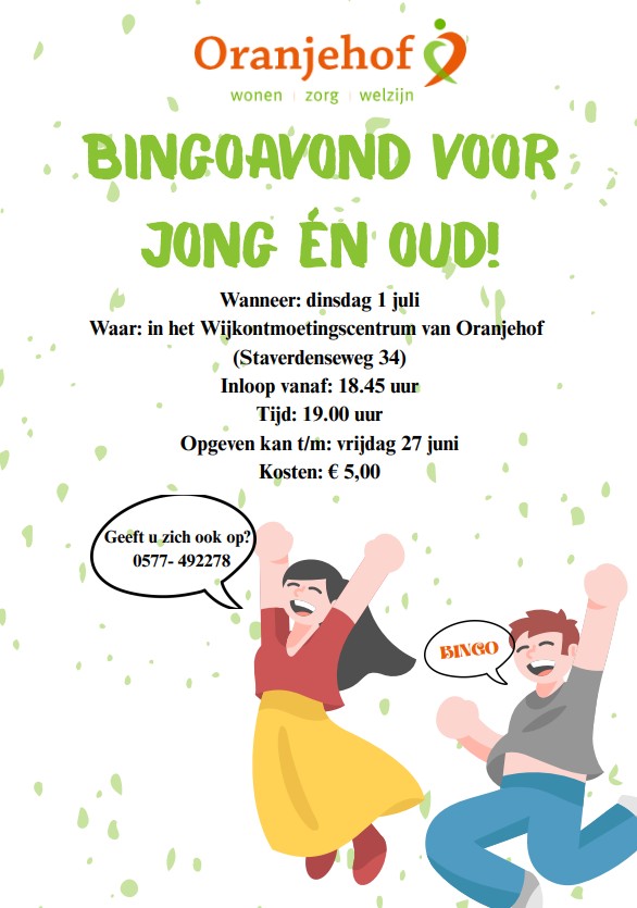 ELSPEET – Van harte welkom op de Bingo avond bij de Oranjehof. Vooraf graag even aanmelden! Het belooft weer een gezellige avond te worden.