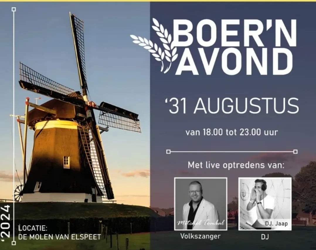 ELSPEET- Zaterdag 31 augustus is het weer zover, de Boer’ndag. Dit jaar gaat restaurant Op de Brink deze dag wederom afsluiten met de Boer’n avond. Echter op een andere locatie dan de afgelopen jaren, namelijk op hetzelfde terrein van de Boer’ndag bij de molen.