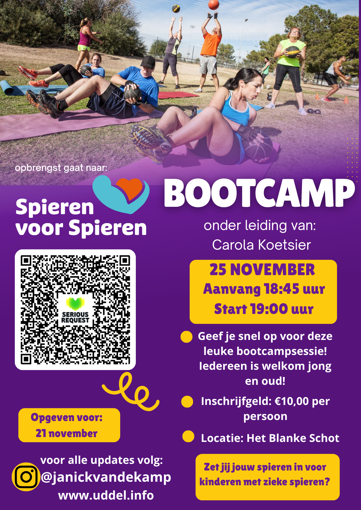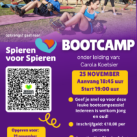 De bootcampsessie begint om 19:00 uur en de aanvang is 18:45 uur. Inschrijfgeld bedraagt €10,00 per persoon. De opbrengst gaat naar stichting Spieren voor Spieren. Locatie is het Blanke Schot, we hopen de bootcampsessie te houden op het veld naast het Blanke Schot. Bij slecht weer geldt het volgende: we zijn niet van suiker, en dan lijkt het net alsof we extra hard gesport hebben en dat we helemaal bezweet thuiskomen.
