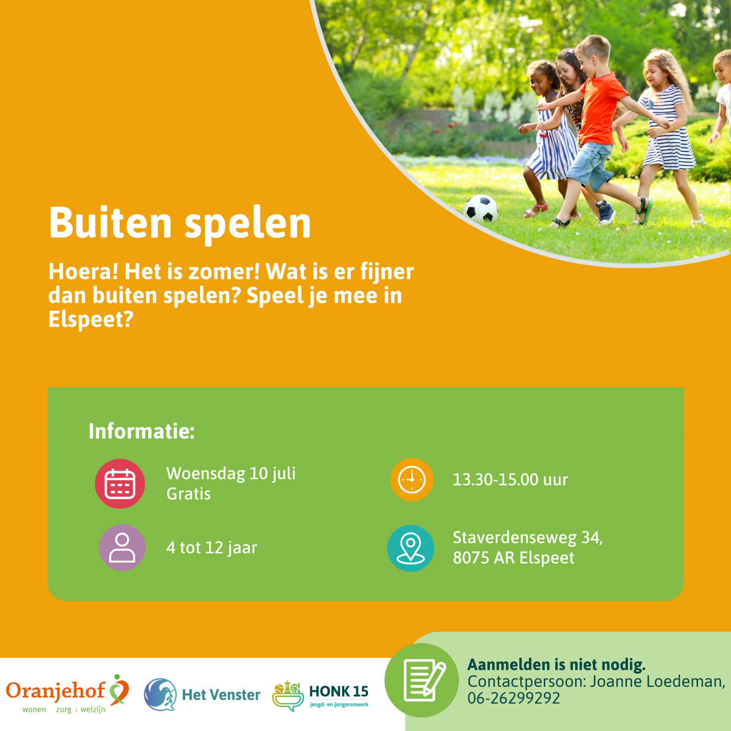 ELSPEET – Het is zomer! En wat is er dan fijner dan buiten spelen? Speel je mee in Elspeet op woensdagmiddag 10 juli? Van 13.30-15.00 uur ben je welkom aan de Staverdenseweg 34. Voor kinderen van 4-12 jaar. Aanmelden is niet nodig!