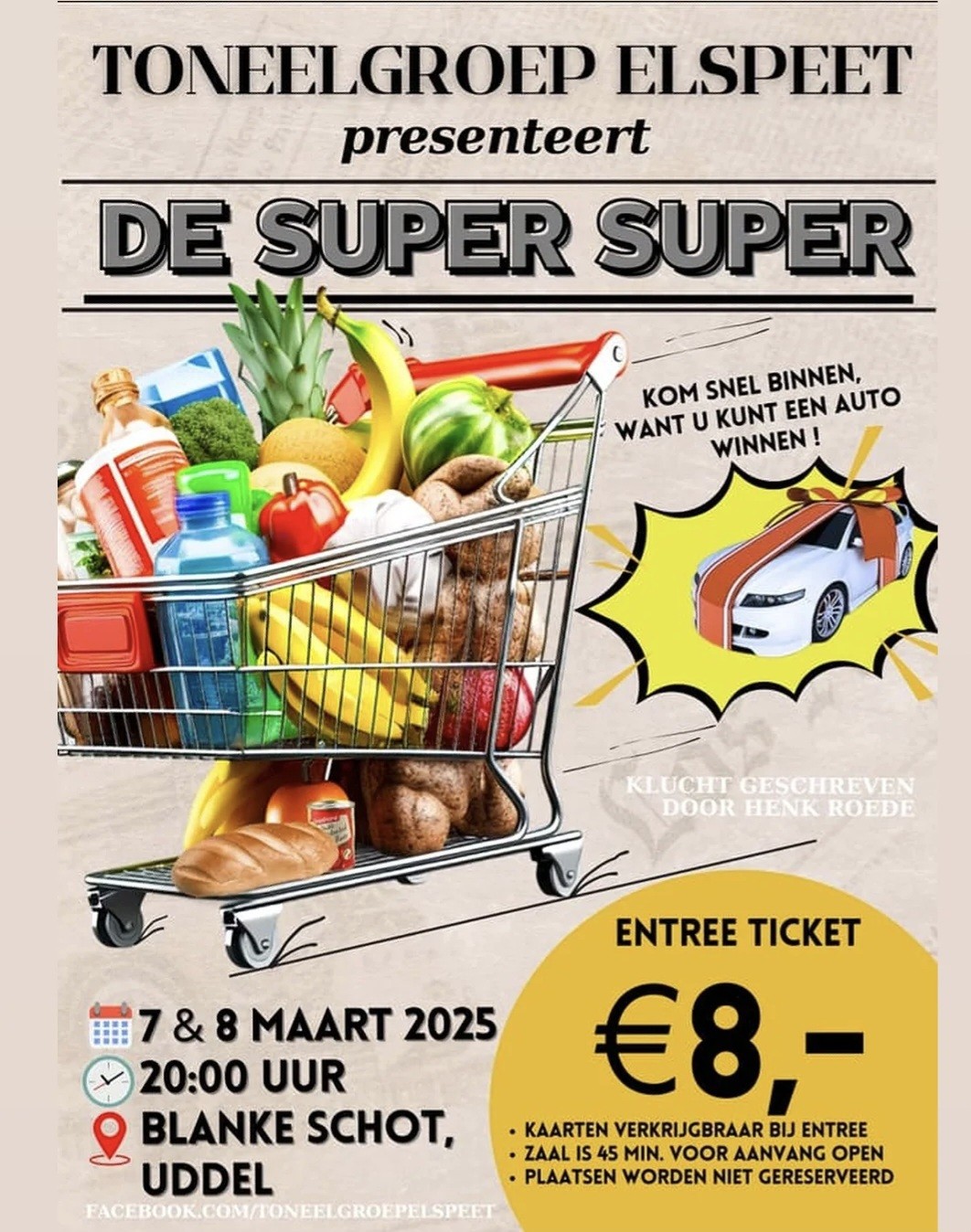 De supermarkt van Sjors is het slechtst lopende filiaal van de keten “Super Super”. Sjors is dan ook geen geboren ondernemer en heeft het ook niet getroffen met zijn kleurrijke personeel. Maar het allergrootste probleem is dat er een jaar geleden een vestiging van Mega Markt is geopend aan de overkant van de straat. De “Super Super” keten geeft Sjors nog één kans om de omzetcijfers op te krikken om zo de merknaam “Super Super” te mogen behouden. Om Sjors hiermee te helpen stuurt de keten hulp, in de vorm van de onervaren Nicolette. Nicolette gaat overijverig aan de slag, maar of alle inspanningen wel zo goed uitpakken? Komische situaties wisselen zich in een snel tempo af in deze klucht in een supermarkt, compleet met hangouderen, accordeonist voor de deur, een op hol geslagen flessenautomaat en nog vele andere gekkigheden.