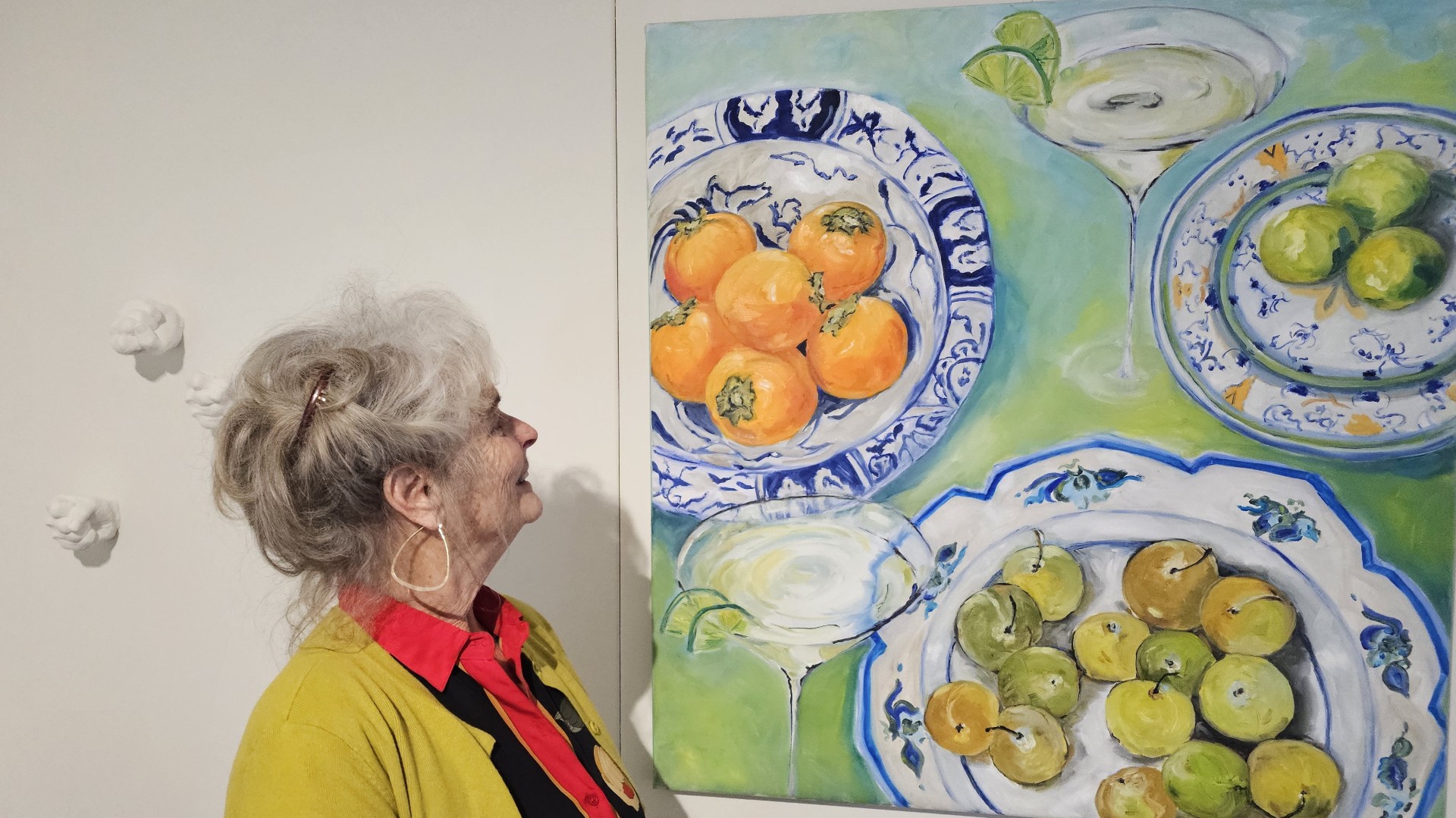 De stillevens hebben een heel ander onderwerp: tafels gedekt met oesters, mosselen, garnalen, citroenen, sinaasappels en wijnglazen. Ingrid: “Marjan stelt de compositie samen door te spelen met gemaakte foto’s. Ze combineert net zo lang met verschillende delen tot ze het begin van een schilderij ziet, waarbij ze goed kijkt naar kleur en lichtval.”