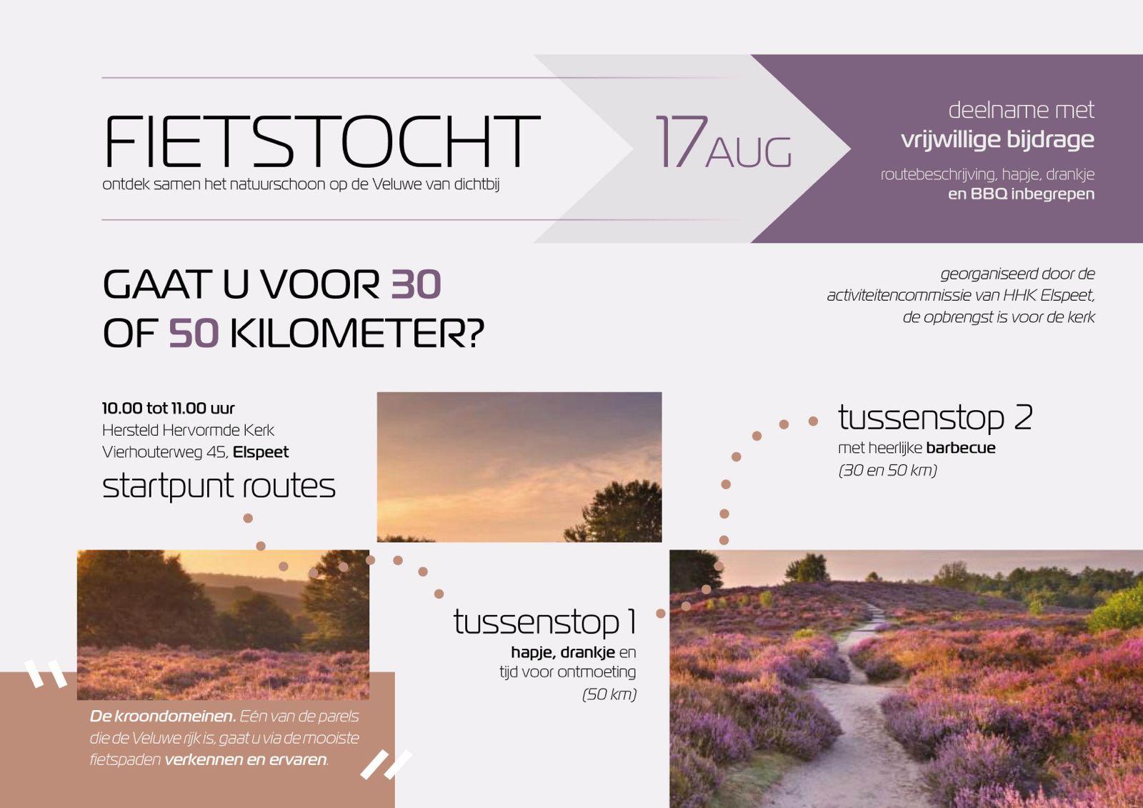 ELSPEET- Ontdek samen het natuurschoon op de Veluwe van dichtbij. Fiets je mee op zaterdag 17 augustus? De fietstocht wordt georganiseerd door de activiteitencommissie van de HHK Elspeet. De opbrengst is voor de kerk. Lees alle informatie op onderstaande flyer.
