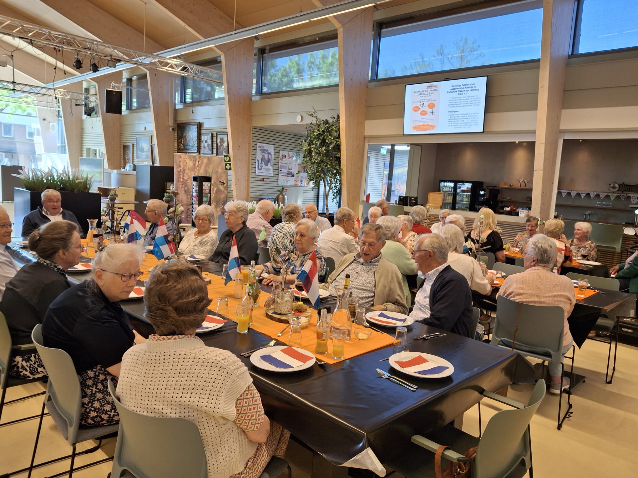 Wie liever niet op de fiets stapte, kon aanschuiven bij de gezamenlijke maaltijd in het Kulturhus. Vanaf 11.30 uur liep de zaal vol en om 12.00 uur werd het eten – patat met een smakelijke snack – geserveerd. De sfeer was uitstekend en de opkomst was zelfs groter dan verwacht. De gezamenlijke maaltijden zijn altijd op de eerste zaterdag van de maand en iedereen is dan welkom.
