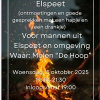 ELSPEET – Op woensdagavond 15 oktober werd alweer de 6e kampvuuravond voor mannen gehouden bij molen de Hoop. De mannen werden verwelkomd met een bakje koffie en om half 8 werden ze welkom geheten door de organisatie. Na een lied gezongen te hebben volgt een korte inleiding, die dit keer over ‘de herder en zijn staf’ ging. Waaronder onze oud herder Cos mouw werd aangehaald en Mozes als voorbeeld werd gegeven. Daarna werden er 7 groepjes gemaakt en onder begeleiding van een groepsleider zijn er een aantal vragen besproken, vragen die dieper gaan als een alledaags gesprek, om zo onderlinge verbondenheid te creëren in Elspeet. Met respect voor elkaar, en niet proberen elkaar te overtuigen, maar te getuigen!