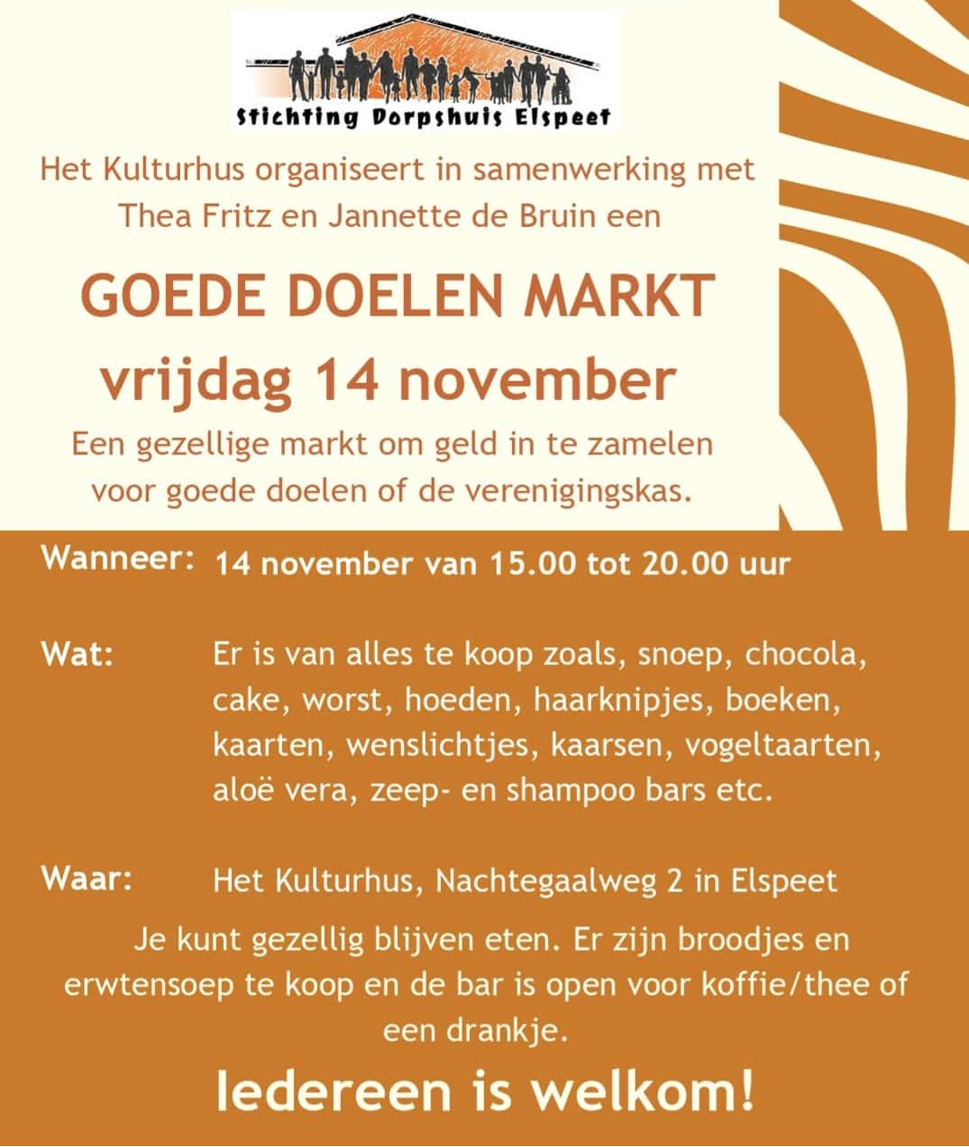 ELSPEET – Vrijdag 14 november (15.00-20.00 uur) is het weer zover: de jaarlijkse goede doelenmarkt in Elspeet! Komt u ook weer gezellig een kijkje nemen? Koop én geef direct aan goede doelen!