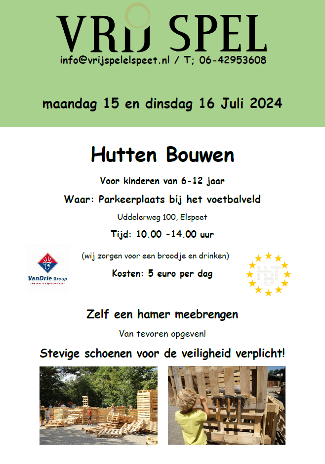 ELSPEET – Op maandag 15 en dinsdag 16 juli 2024 organiseert Vrij Spel de 7e editie Hutten bouwen voor alle kinderen uit Elspeet en Uddel van 6-12 jaar. Samen hutten bouwen op de parkeerplaats bij het voetbalveld tussen 10-14.00 uur. Breng je eigen hamer mee en trek stevige schoenen aan.