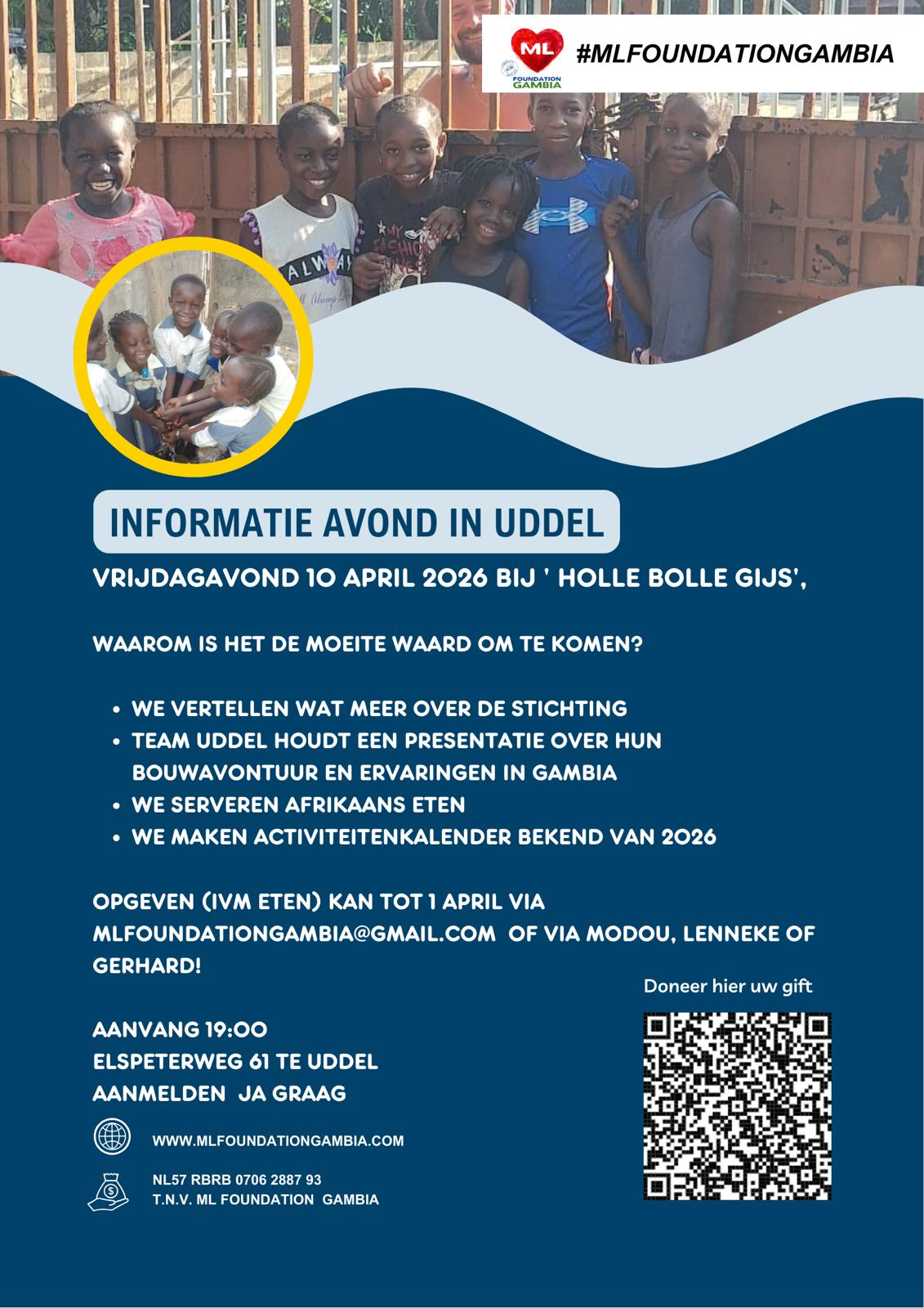 UDDEL – Ben jij benieuwd naar de impact van ML Foundation Gambia? En wil je meer weten over onze projecten? We nodigen je van harte uit om op vrijdag 10 april 2026 onze Informatieve Avond bij te wonen in het pand van Holle Bolle Gijs, Dit is een unieke gelegenheid om inzicht te krijgen in ons werk en de ervaringen die we hebben opgedaan tijdens onze bouwavonturen in Gambia.