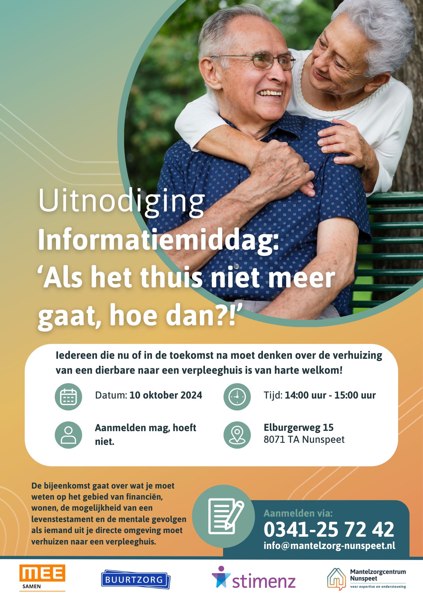 Iedereen die nu of in de toekomst na moet denken over de verhuizing van een dierbare naar een verpleeghuis is van harte welkom!