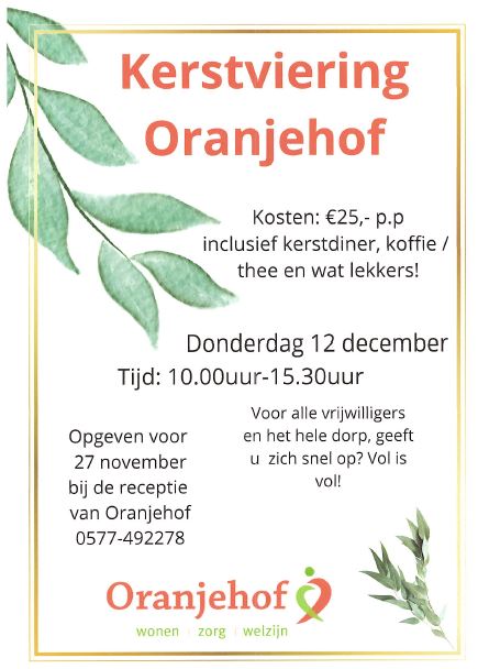 ELSPEET – Op donderdag 12 december is er een kerstviering van 10.00 – 15. 30 uur bij de Oranjehof. Een hartelijk welkom aan alle vrijwilligers en de rest van het dorp. Lees de flyer voor alle informatie en vergeet je niet op te geven!