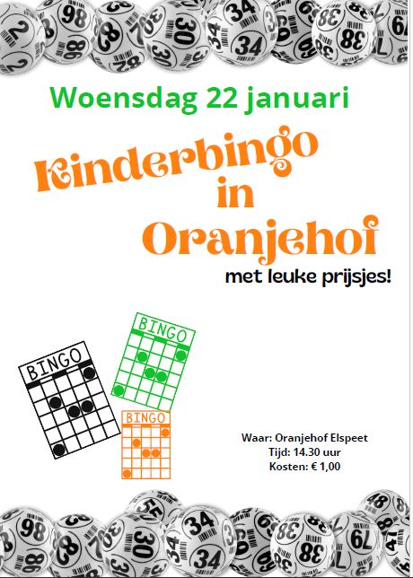 ELSPEET – LET OP! Kinderbingo in Oranjehof! Ben jij fanatiek en wil je ook een leuke prijs winnen? Een hartelijk welkom aan alle kinderen.