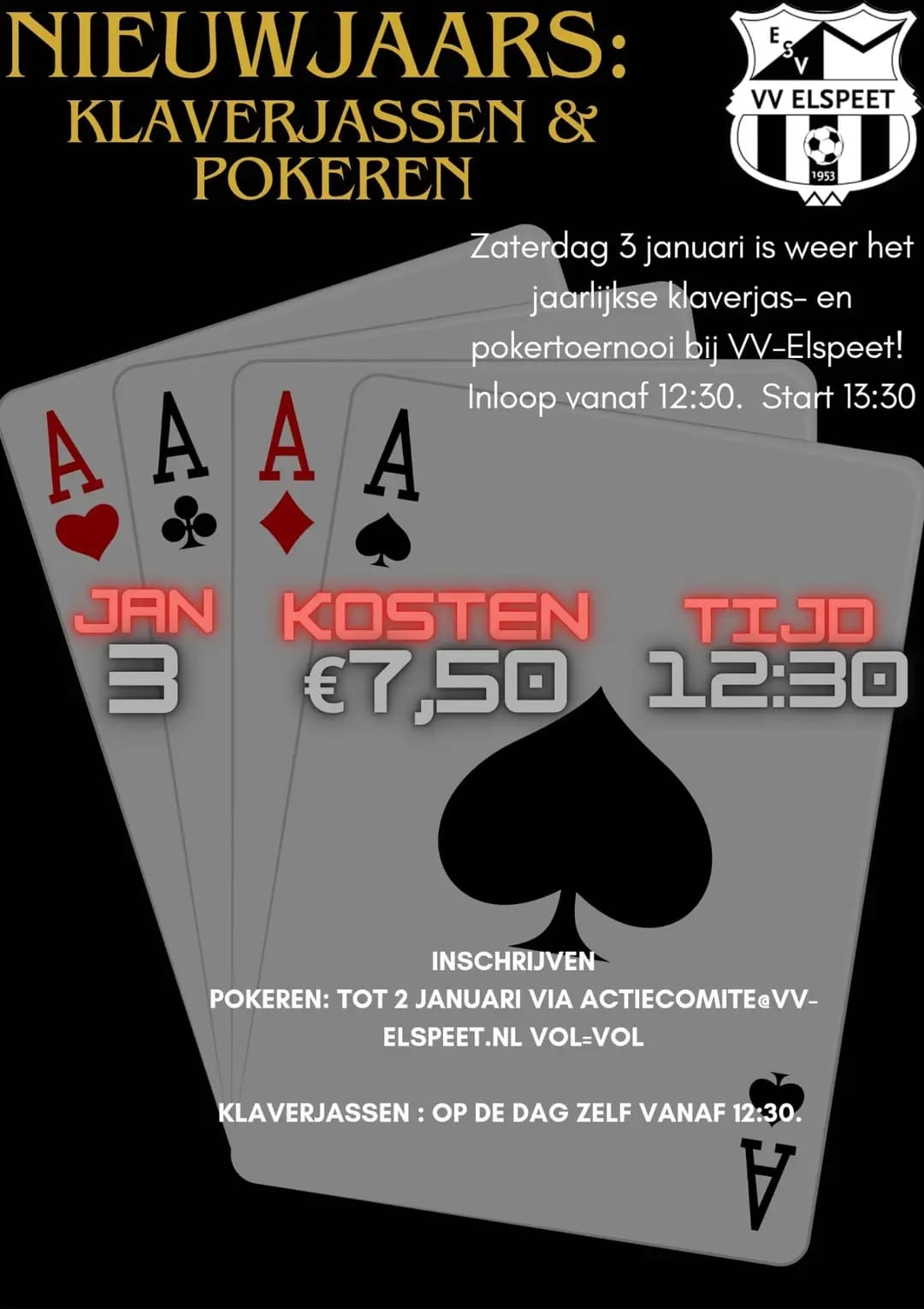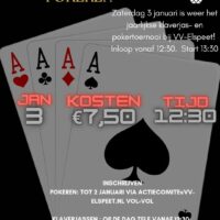 ELSPEET – Zaterdag 3 januari is het jaarlijkse klaverjas- en pokertoenooi bij VV-Elspeet. Inschrijven kan tot 2 januari!