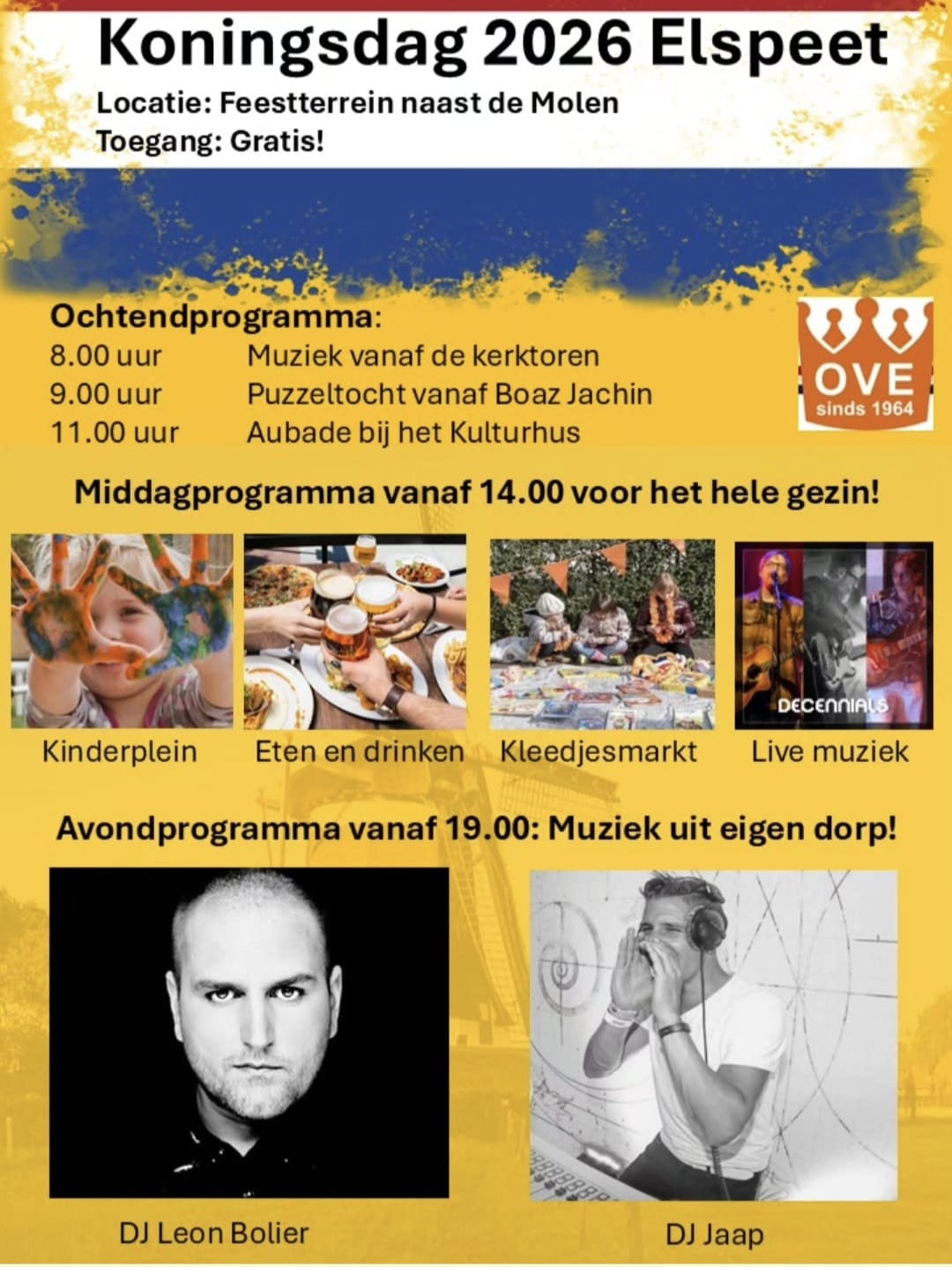 ELSPEET – Het programma van Koningsdag 2026 is bekend. Met o.a. de traditiegetrouwe activiteiten als de muziek vanaf de kerktoren, de aubade en een verrassend middag- en avondprogramma. Lees alle informatie op de flyer en verheug je vast op een feestelijke dag.