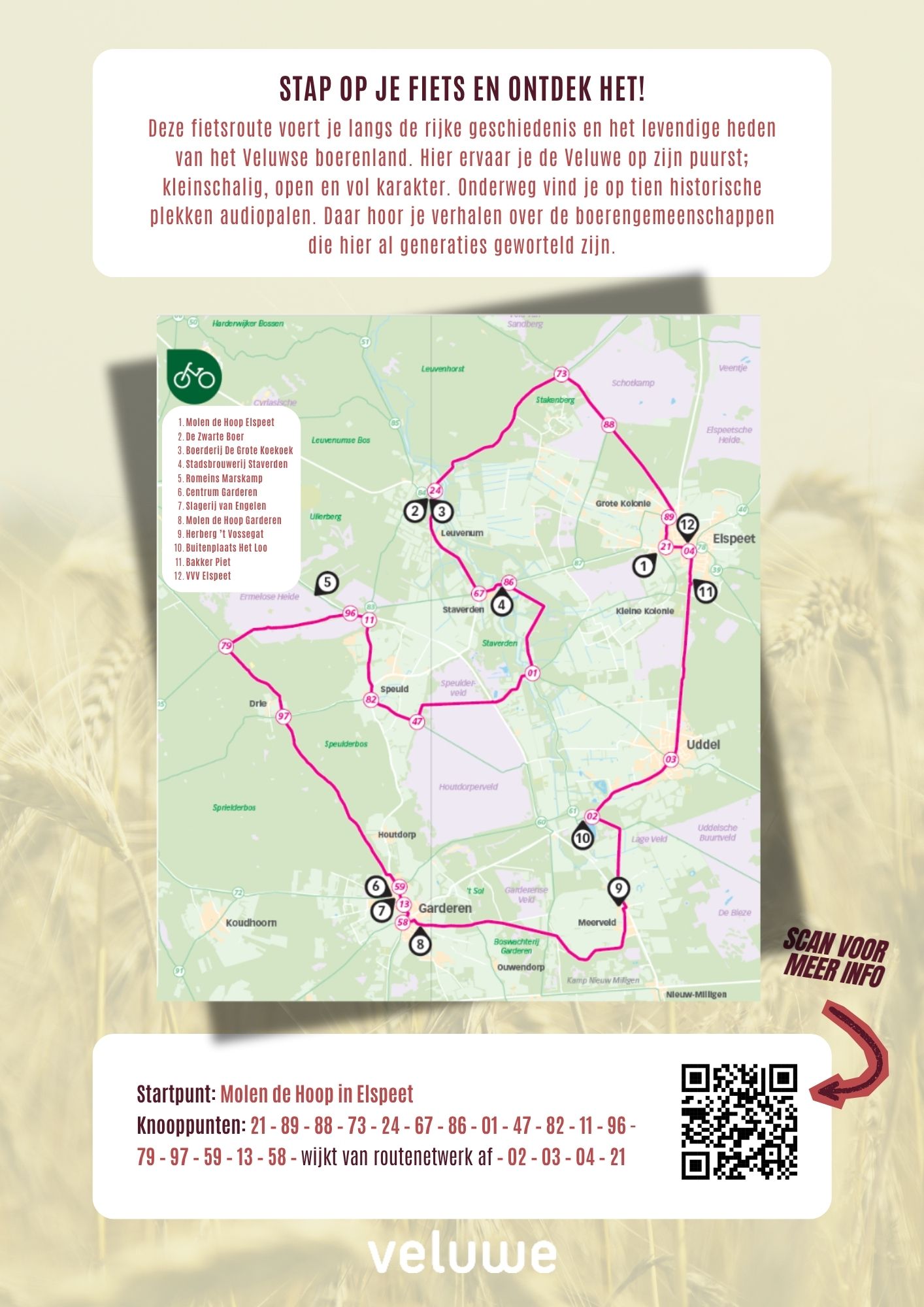 ELSPEET – Een fietstocht over de Veluwe en wel te beginnen in Elspeet bij Molen de Hoop. Dat wil toch iedereen?! Deze fietsroute brengt je langs boerenerven en oude akkers. Maar liefst 35 kilometer fietsplezier vol verhalen: de Veluwe op zijn puurst. Voor verdere informatie, zie flyers.
