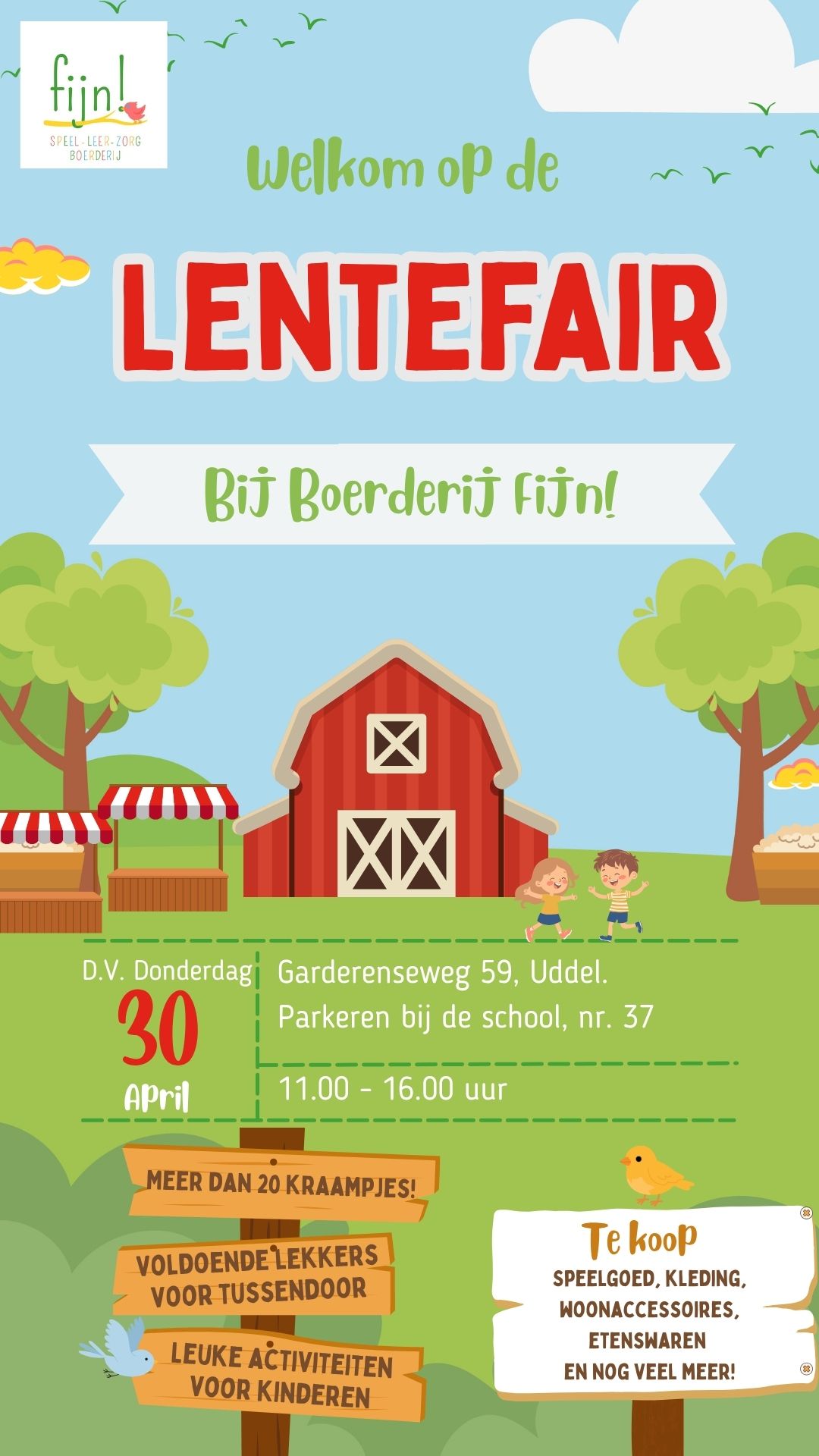 UDDEL – Van harte welkom D.V. 30 april van 11.00-16.00 uur op onze lentefair. Een erf vol kraampjes en activiteiten. Er is veel te koop, van woonaccessoires, tot speelgoed, lekkers, kleding en accessoires, schoonmaakartikelen en nog veel meer! Ook hebben we een leuke Staphorster workshop voor jong en oud, zijn er veel speelactiviteiten en kunt u ook een hapje eten.