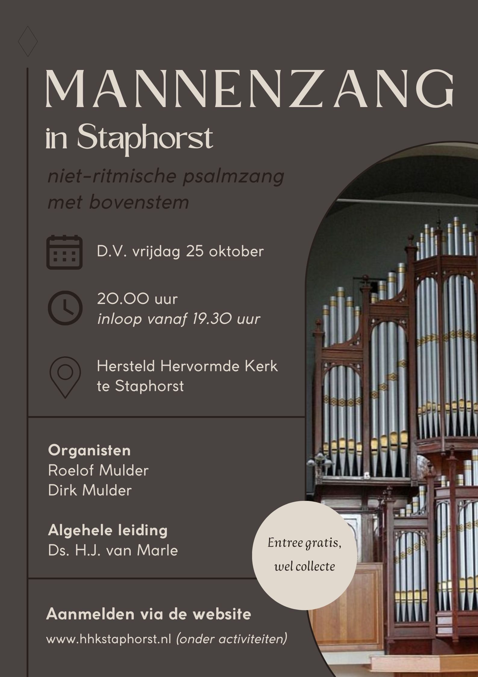 STAPHORST- D.V. vrijdag 25 oktober staat er een mannenzangavond gepland. Voor deze avond worden alle mannen, jong en oud, van harte uitgenodigd voor het zingen van niet-ritmische psalmzang mét bovenstem. Het orgel zal bespeeld worden door Roelof Mulder en Dirk Mulder. Algehele leiding door ds. H.J. van Marle.