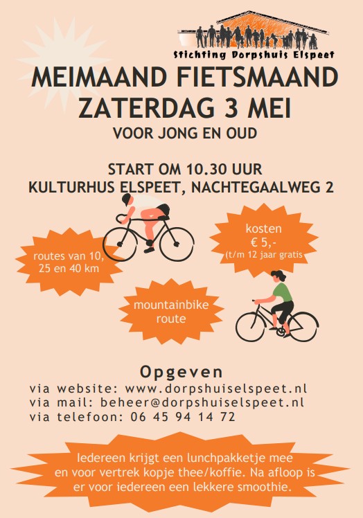 ELSPEET – Op zaterdag 3 mei a.s. wordt er in het kader van de Meimaand fietsmaand weer een gezellige fietsdag georganiseerd vanaf ’t Kulturhus in Elspeet. Gaat u deze sportieve uitdaging aan? Meldt u aan door een appje te sturen naar 06-45941472 of mail naar beheer@dorpshuiselspeet.nl. Zie voor meer informatie de flyer.