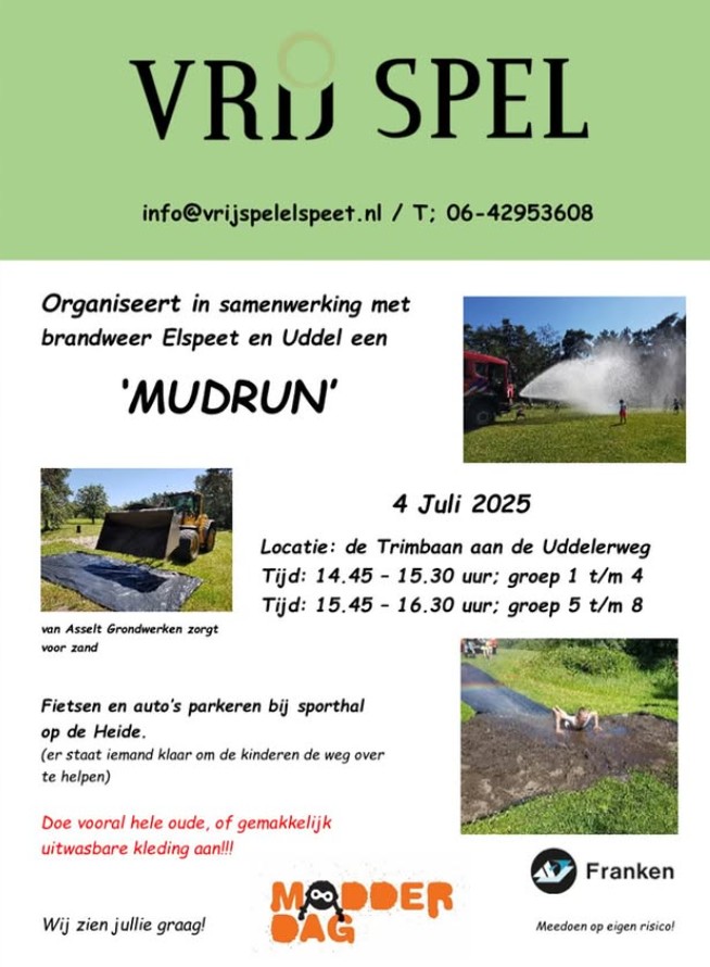 ELSPEET – Vrij Spel organiseert in samenwerking met Brandweer Elspeet en Brandweer Uddel weer een MUDRUN. Lees alle informatie op de flyer. Modder jij ook mee?