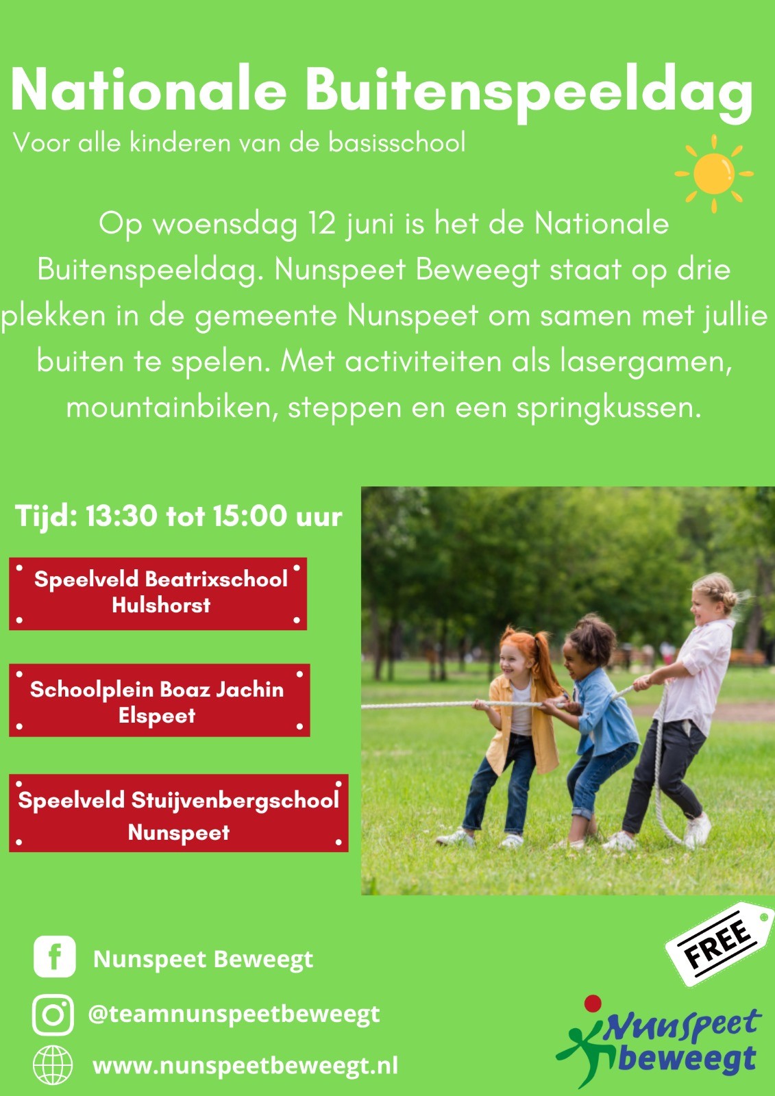 ELSPEET – Op woensdag 12 juni is het Nationale Buitenspeeldag en dat laat de Gemeente Nunspeet niet zomaar voorbij gaan. Voor alle kinderen van de basisscholen worden er activiteiten georganiseerd door Nunspeet Beweegt. Met activiteiten als lasergamen, mountainbiken, steppen en een springkussen is er voor alle kinderen wat te beleven! Bekijk de flyer voor meer informatie.