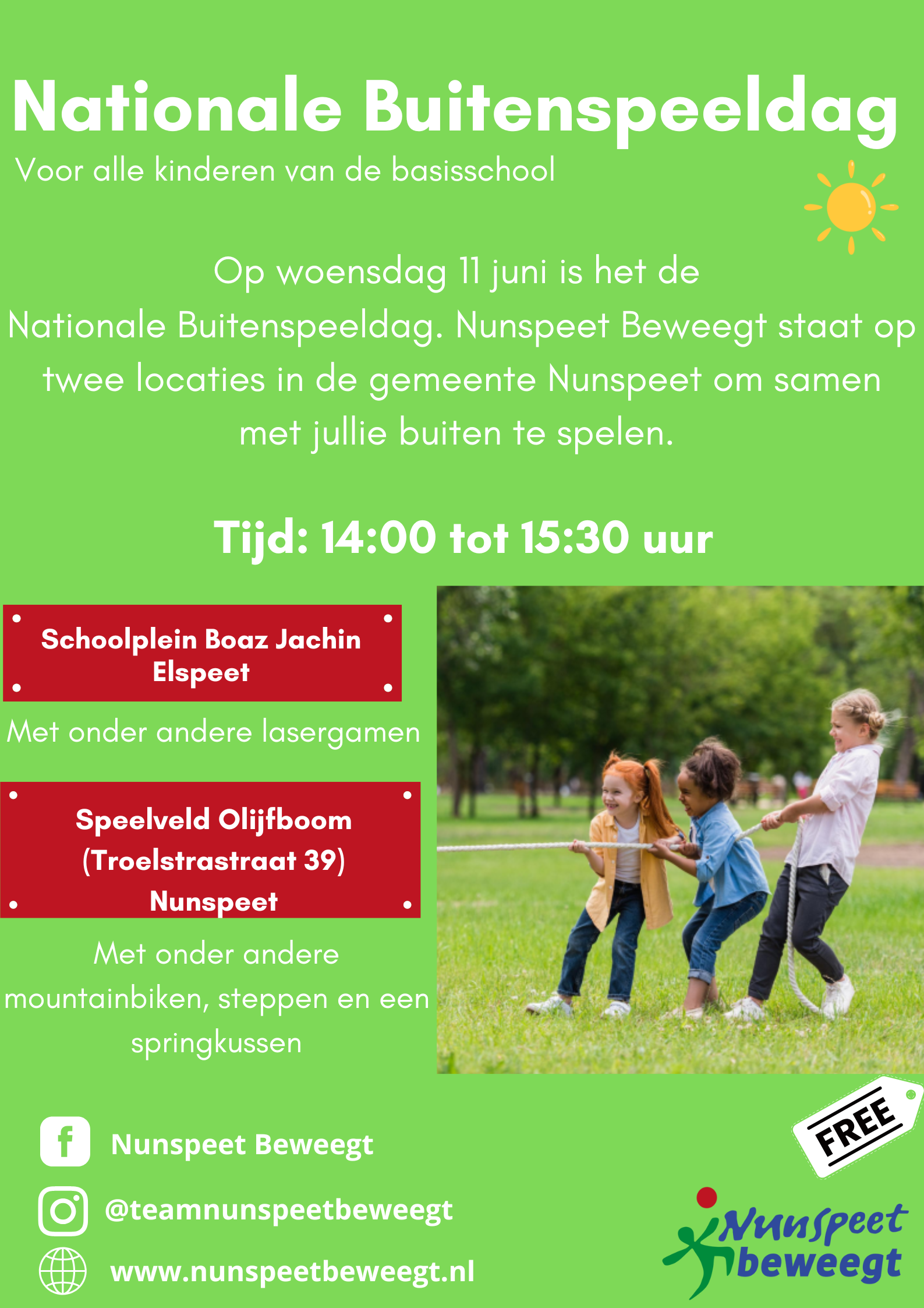 ELSPEET – Op woensdag 11 juni is het de Nationale Buitenspeeldag. Nunspeet Beweegt organiseert op twee plekken in de gemeente Nunspeet activiteiten voor kinderen van de basisscholen! Met onder andere lasergamen, mountainbiken, een springkussen en nog veel meer beloofd het een gezellige en sportieve middag te worden! Jij komt toch ook?
