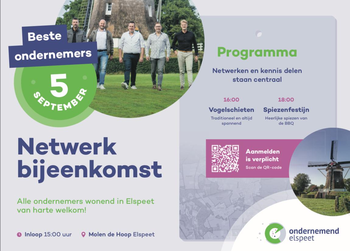ELSPEET – DV vrijdag 5 september opent Ondernemend Elspeet het nieuwe seizoen met een gezellige ondernemersbijeenkomst! Ben of ken jij ondernemers uit Elspeet? Nodig ze uit en kom gezellig (samen) sfeer proeven. Alle ondernemers – dus ook niet leden- zijn van harte welkom vanaf 15.00 uur bij Molen de Hoop in Elspeet. Zien we jou daar?