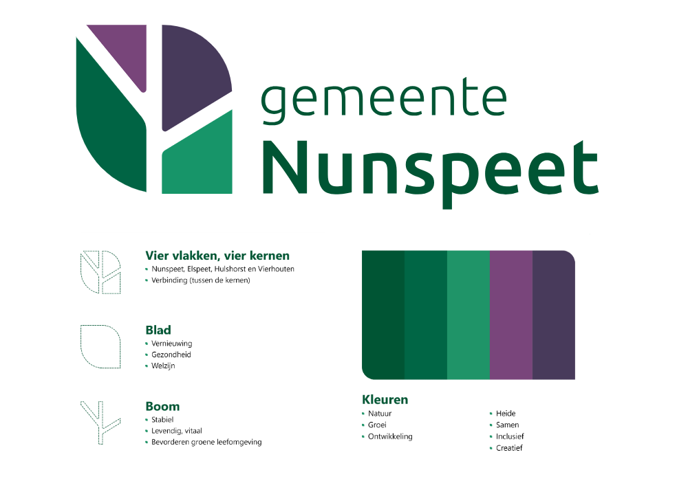 De groene kleur benadrukt de natuur, groei en ontwikkeling. Maar Nunspeet is meer dan alleen groen. Daarom ook de paarse accenten, die verwijzen naar de uitgestrekte heidevelden. Paars staat bovendien voor verbinding, creativiteit, inclusiviteit en samenhang – waarden die de gemeente belangrijk vindt en wil uitstralen.