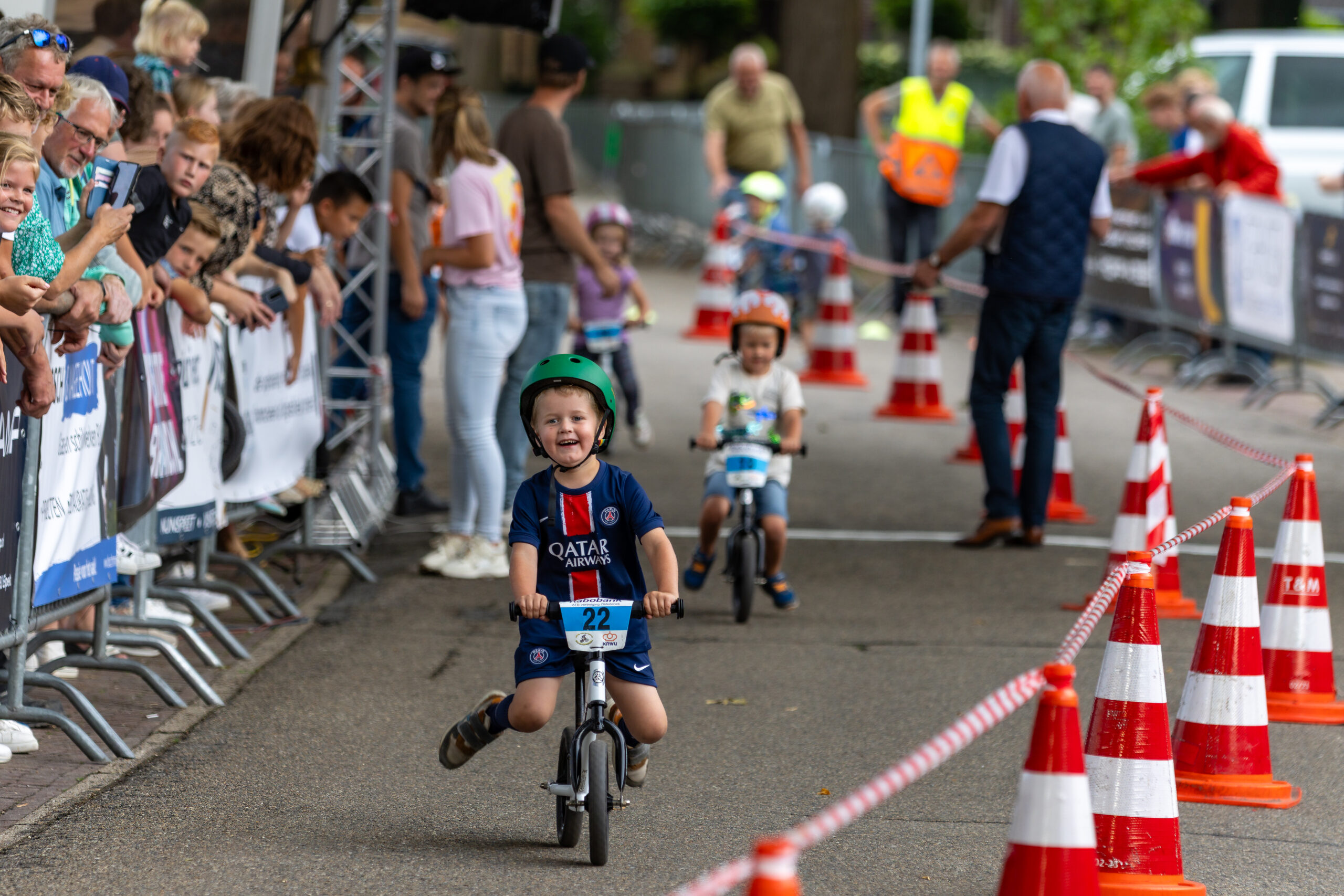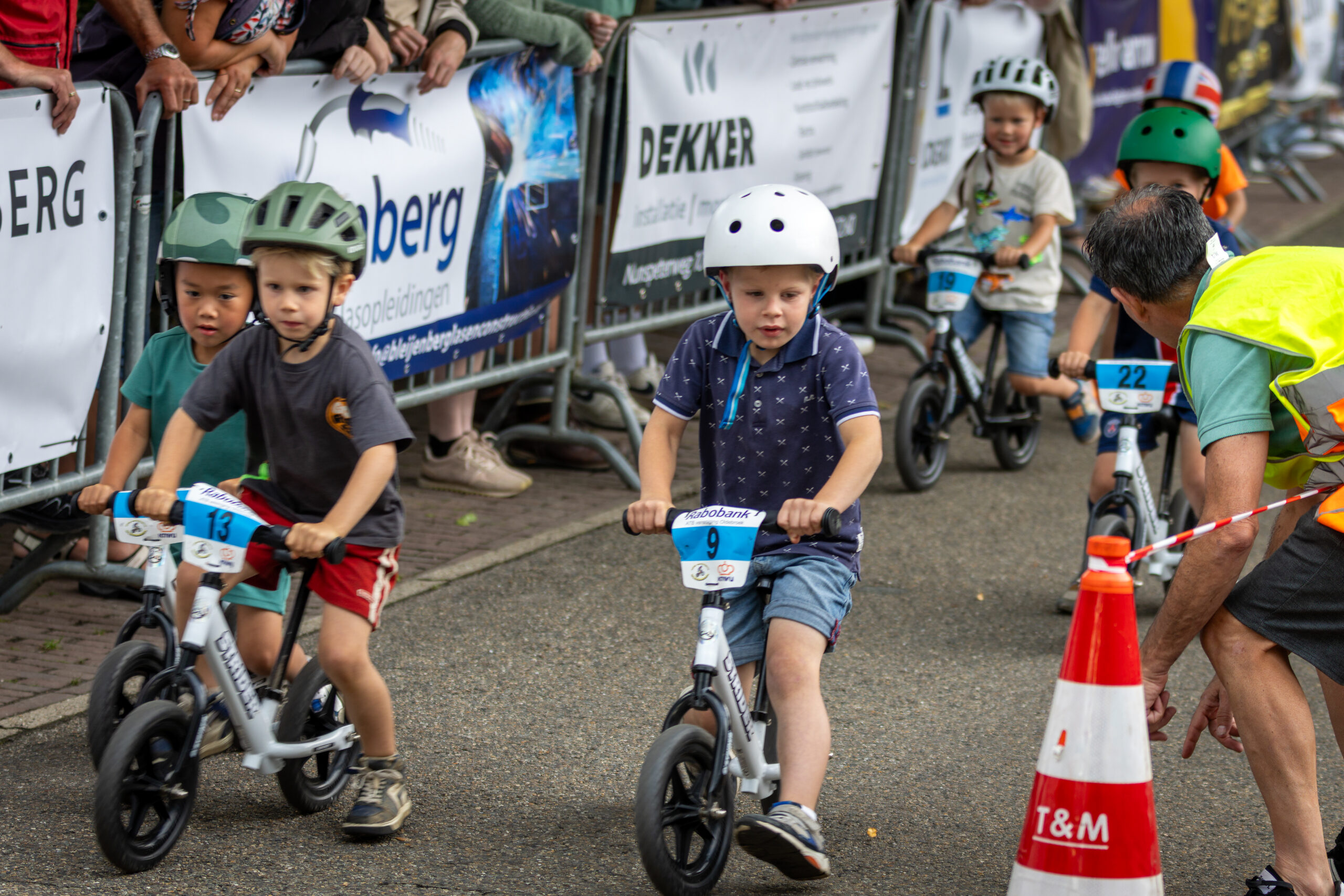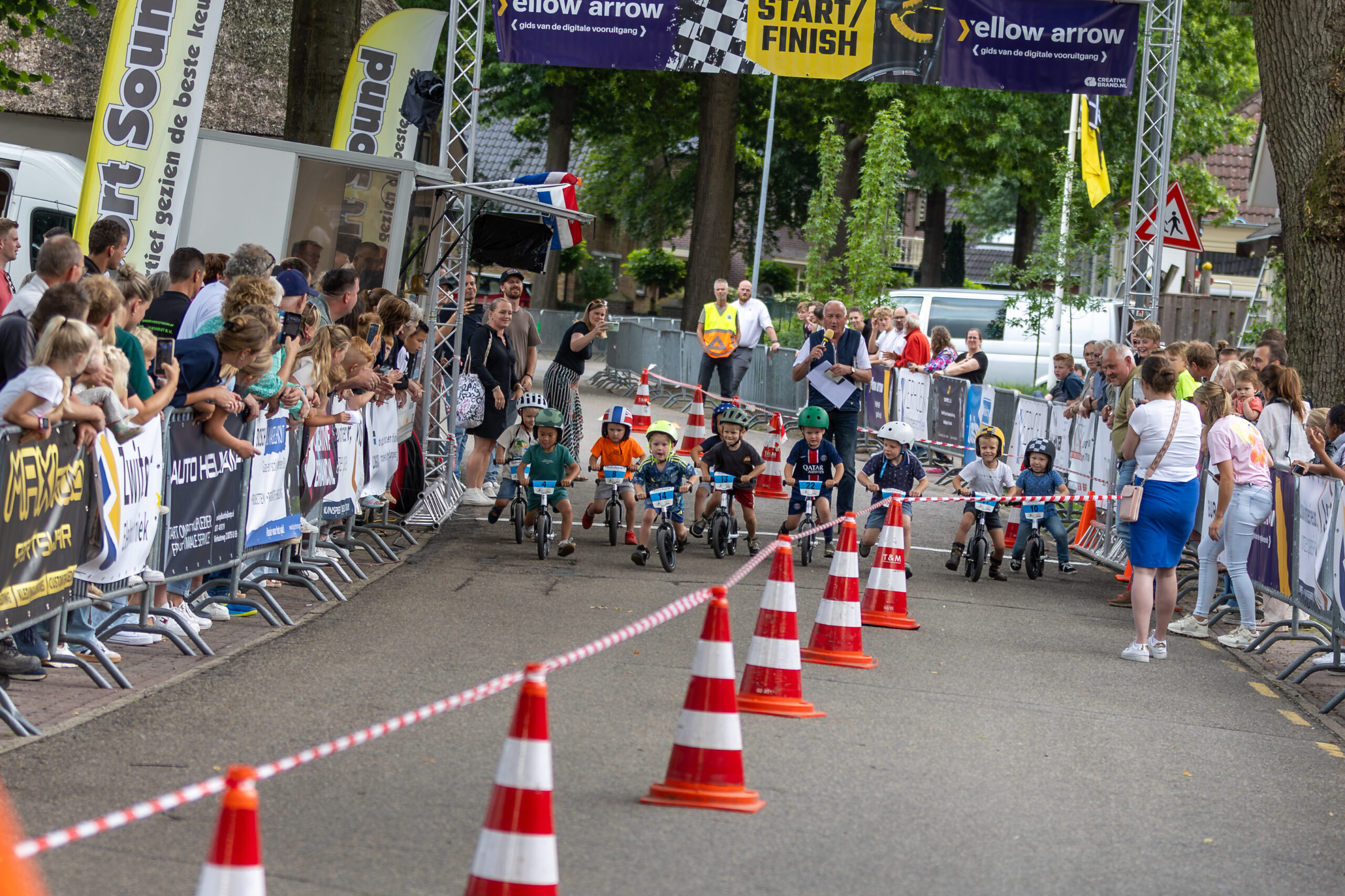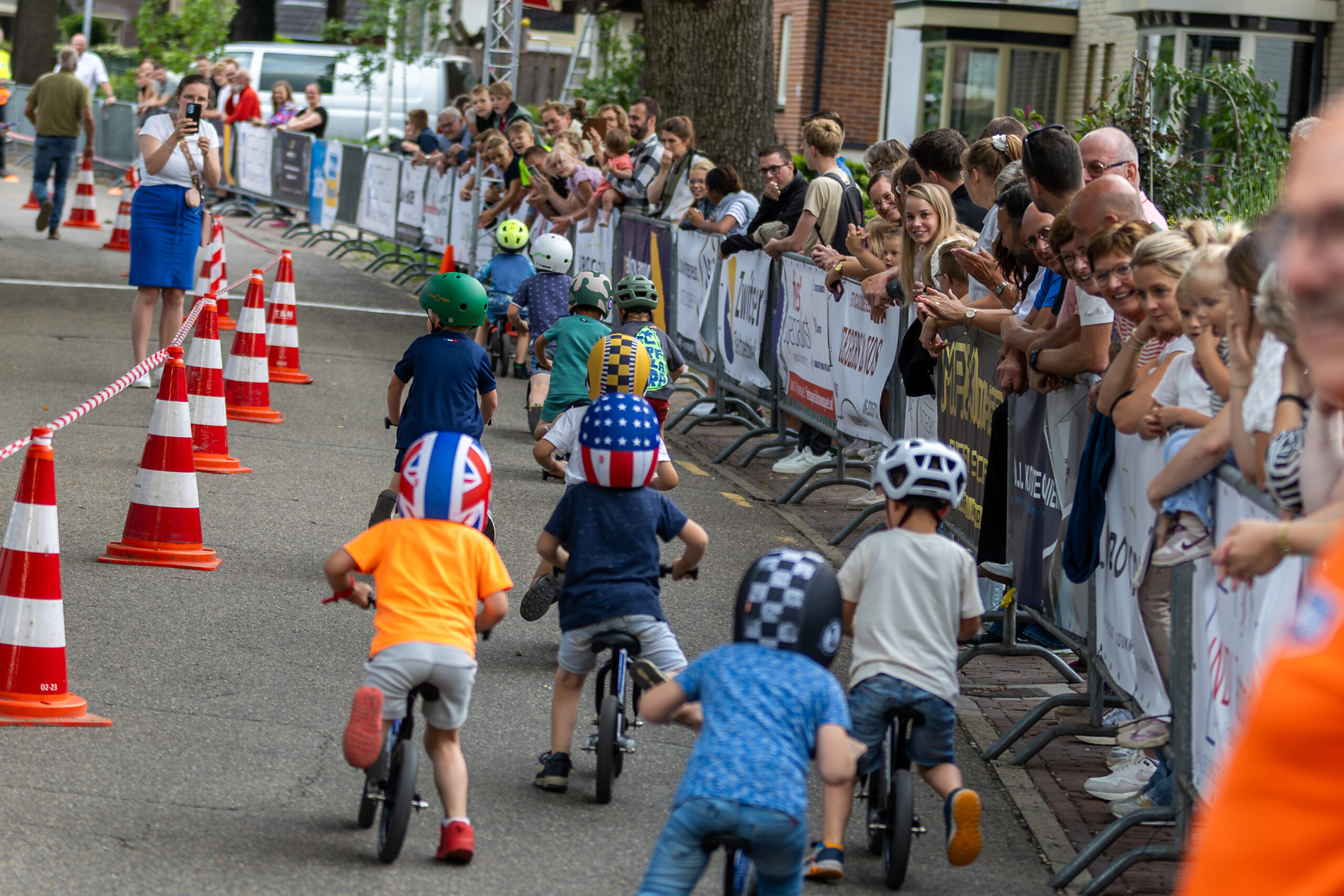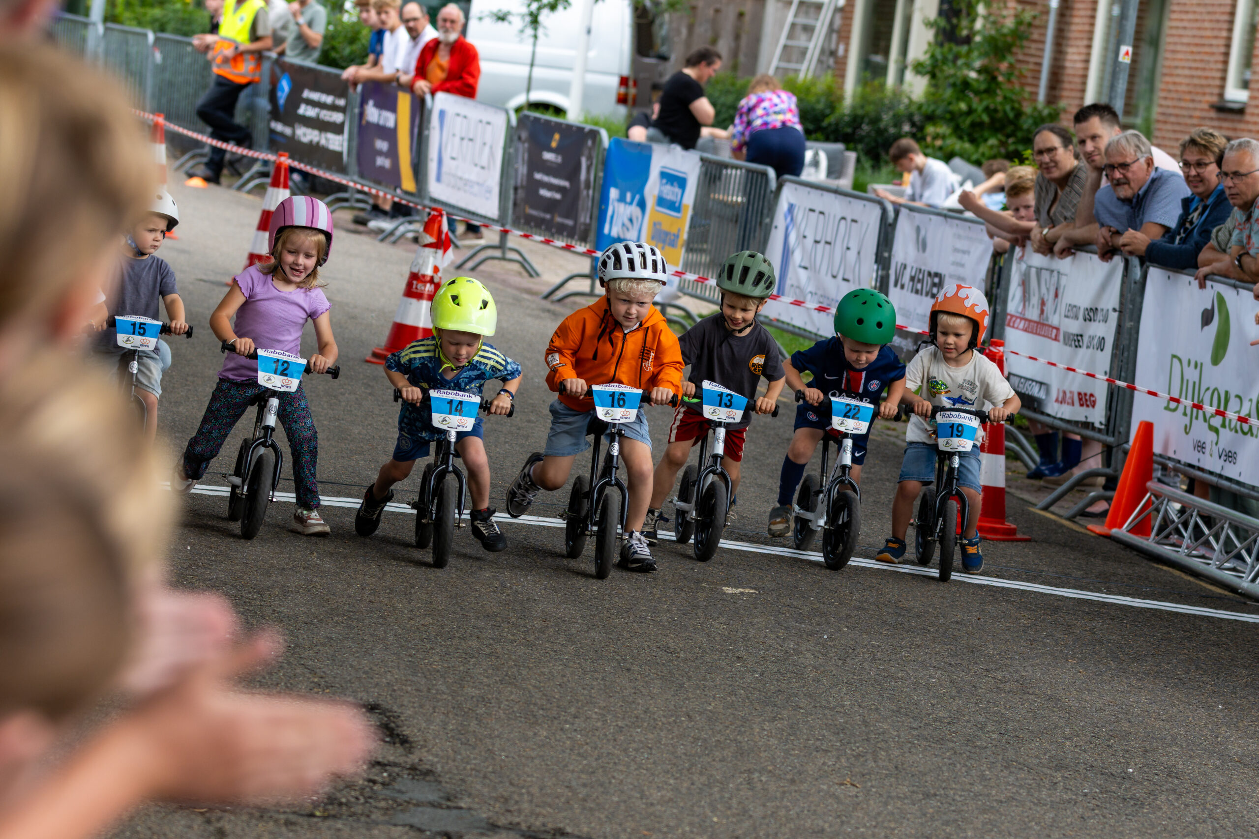 Zo genoot jong en oud van het wielerspektakel, dat al om 18.30 uur begon met de loopfietsjeswedstrijd. Een parcoursje van zo’n 200 meter uitgezet op de finishstraat – de Apeldoornseweg bij Restaurant Op de Brink) moesten kinderen van 2 en 3 jaar en 4 en 5 jaar zo snel mogelijk afleggen. Winnaars waren Esra Lamberink (2-3-jarigen) en Noah Lamberink (4-5-jarigen). “De finishlijn stond vol met ouders en opa’s en oma’s. Er deden 41 kinderen mee. Sommigen liepen met lange passen, anderen zaten schuin op hun fietsje. Dat de kinderen zo genieten, is een prachtig gezicht”, zei Arie ten Hove van de organisatie namens ATB-vereniging Oldebroek. Fietsen en helmpjes werden door Henk Mulder en Lammert Vos geregeld. Ze stonden al in Dronten en Epe en komen op 20 juli ook nog naar Nunspeet met de loopfietsjes.