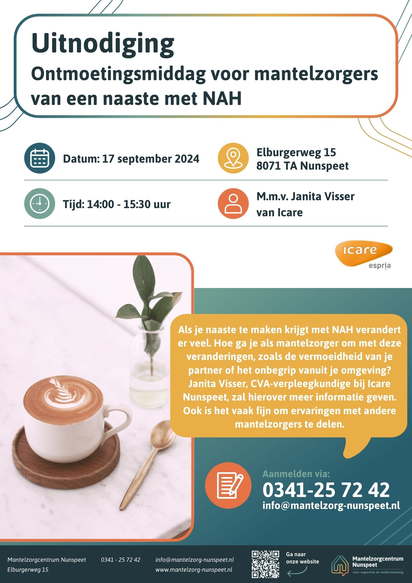 NUNSPEET- Als je naaste te maken krijgt met NAH verandert er veel. Hoe ga je als mantelzorger om met deze veranderingen, zoals de vermoeidheid van je partner of het onbegrip vanuit je omgeving? Janita Visser, CVA-verpleegkundige bij Icare Nunspeet, zal hierover meer informatie geven. Ook is het fijn om ervaringen met andere mantelzorgers te delen, hier is volop ruimte voor.