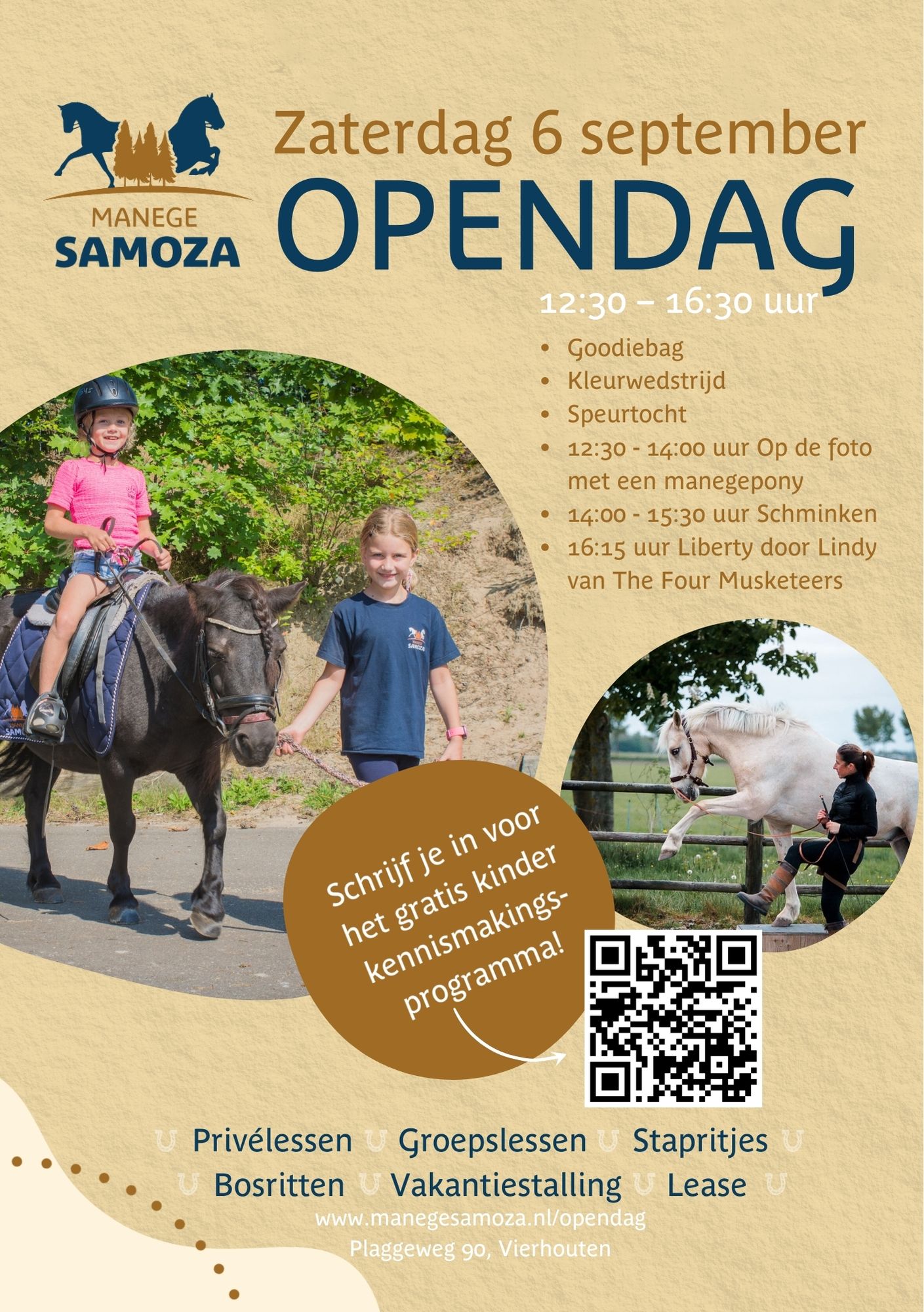Open Dag Manege Samoza: paardenplezier voor jong en oud in hartje Veluwe Op zaterdag 6 september opent Manege Samoza feestelijk de deuren voor jong en oud tijdens een bruisende Open Dag. Van 12.30 tot 16.30 uur zijn bezoekers van harte welkom aan de Plaggeweg 90 in Vierhouten om kennis te maken met de veelzijdige wereld van paardrijden. Het belooft een middag vol beleving en gezelligheid te worden, met activiteiten als een kleurwedstrijd, speurtocht, schminken en de mogelijkheid om op de foto te gaan met een manegepony. Voor ieder kind ligt bovendien een goodiebag klaar. Het hoogtepunt van de dag is de liberty-show van Lindy van The Four Musketeers om 16.15 uur, waarin de unieke band tussen mens en paard centraal staat.