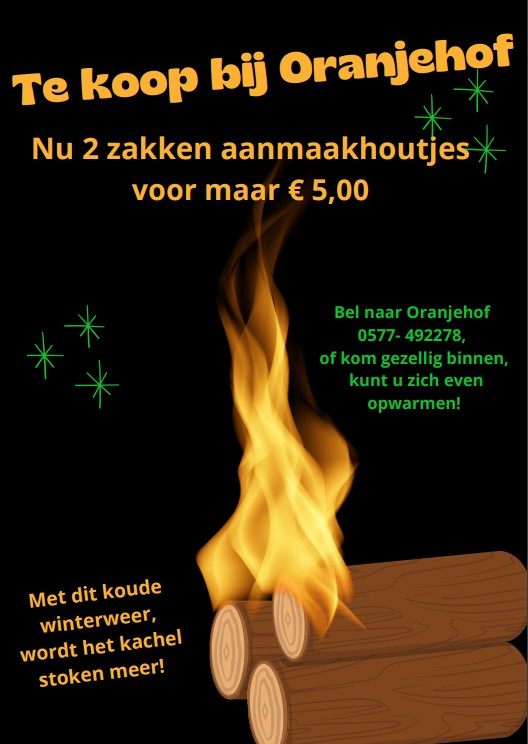 ELSPEET – Tijdens koude dagen is het heerlijk om binnen bij de warme kachel te vertoeven. Aanmaakhoutjes zijn natuurlijk onmisbaar om het vuur in de kachel eenvoudig aan te maken. De Oranjehof verkoopt aanmaakhoutjes, zie onderstaande flyer voor alle informatie.