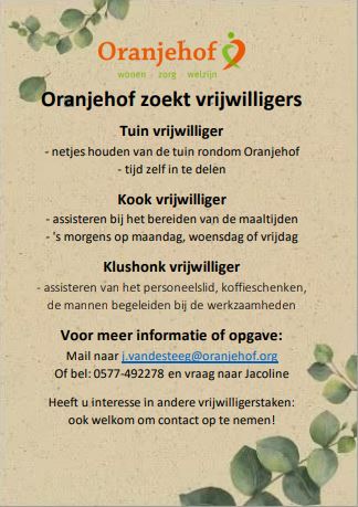 ELSPEET – Bij de Oranjehof zijn ze op zoek naar diverse vrijwilligers. Wilt u een steentje bijdragen? Lees dan onderstaande informatie voor de diverse functies.