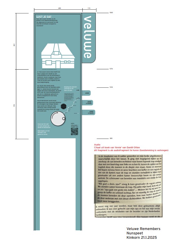 Hieronder vindt u het ontwerp van het object. Het verhaal dat wordt verteld, is van Daniël Otten (1938-2025). Voor zijn moeder is in 2022 een Stolpersteine gelegd aan de Dorpsstraat 6. Lees meer: Stolpersteine Dorpsstraat – Nunspeet uit de Kunst.