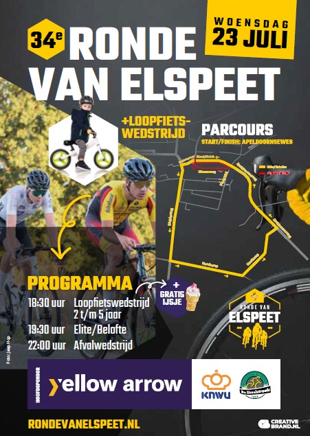 ELSPEET – Op woensdag 23 juli wordt de 34e Ronde van Elspeet gereden. Om 18.30 uur wordt er een loopfietsjeswedstrijd voor kinderen gehouden. Het parcours is enkele honderden meters en kinderen van 2 tot en met 5 jaar kunnen deelnemen. Opgeven voor de loopfietswedstrijd kan via: www.rondevanelspeet.nl. Graag naam en geboortedatum doorgeven, de organisatie zorgt voor fietsjes en helmen. Voor alle kids is er naderhand een gratis ijsje.