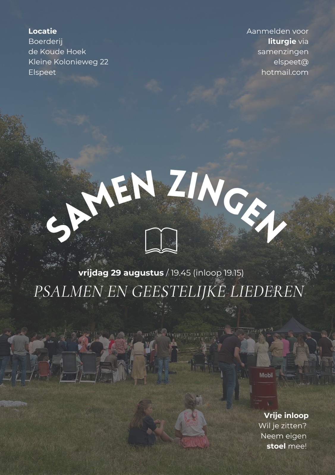 ELSPEET – Vrijdag 29 augustus is het weer zover: samen zingen in de open lucht bij Boerderij de Koude Hoek in Elspeet. Er is weer een prachtig programma samengesteld met o.a. de volgende liederen: Samen in de naam van Jezus, Psalm 139, Psalm 19, Uit de diepten roep ik tot U, Als ik naar de bergen kijk, Abba Vader en nog veel meer mooie liederen/psalmen. Ook is er ruimte om zelf een lied voor te dragen voor het programma. Mis het niet, van harte welkom aan de Kleine Kolonieweg 22!