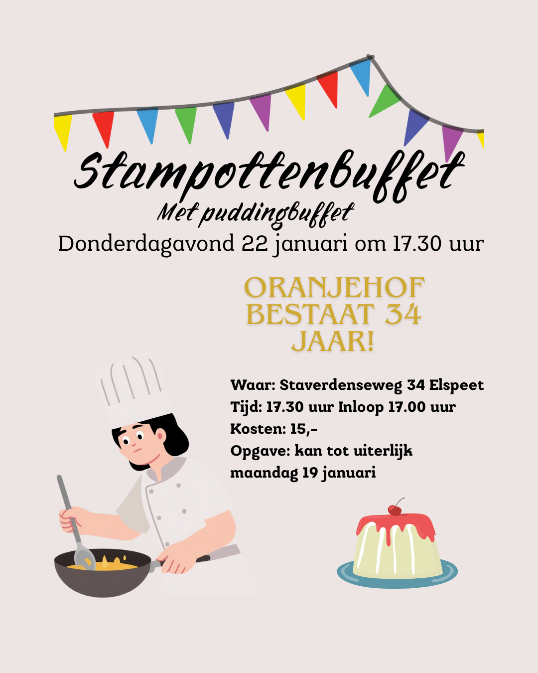 ELSPEET – Smul mee met het stampottenbuffet bij de Oranjehof op donderdag 22 januari. Lees alle informatie op de flyer en vergeet niet om u op te geven!
