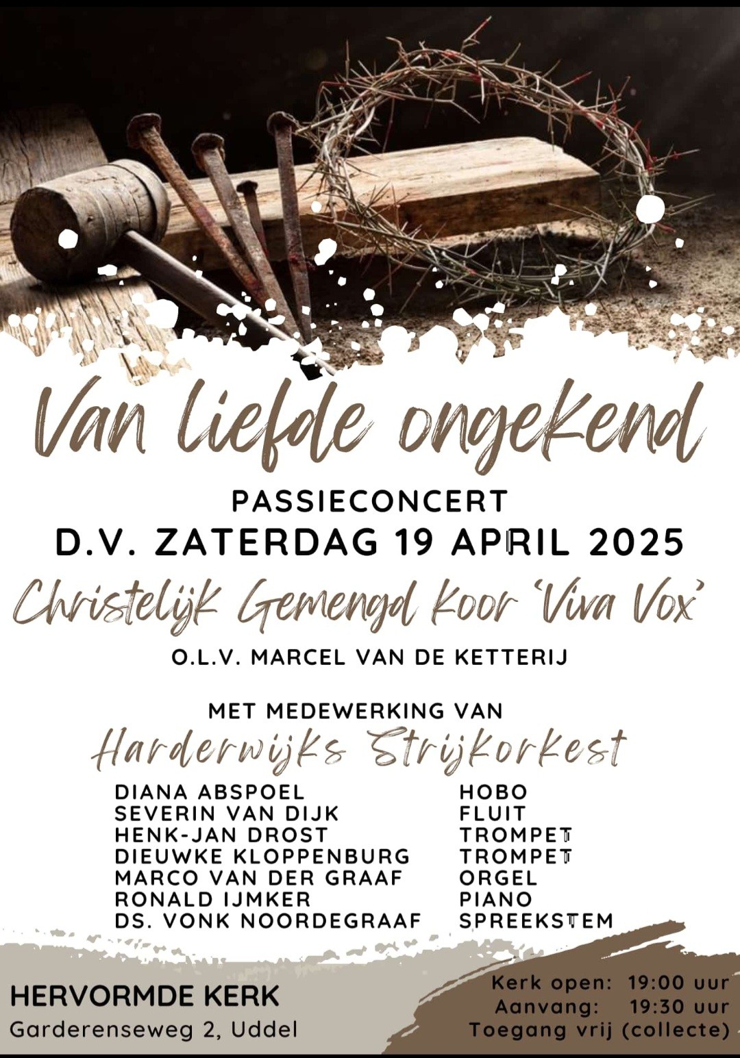 UDDEL – DV. zaterdag 19 april heeft Christelijk Gemengd koor ‘Viva Vox’ een passieconcert met als thema: Van liefde ongekend. Onder leiding van Marcel van de Ketterij en met medewerking van het Harderwijks Strijkorkest belooft het een mooie avond te worden! Van harte welkom in de Hervormde kerk aan de Garderenseweg 2 in Uddel.