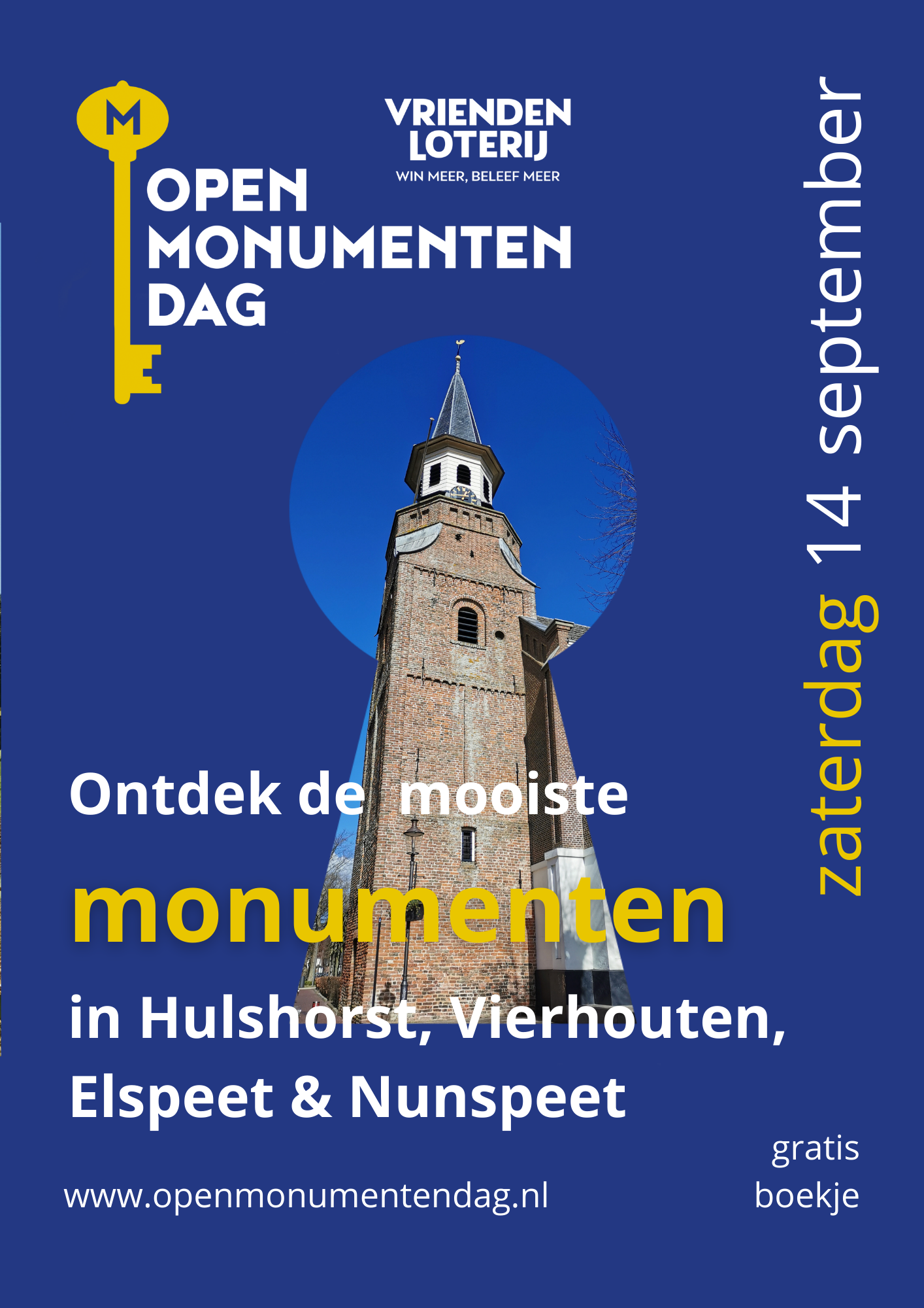 Op zaterdag 14 en zondag 15 september openen door het hele land weer duizenden monumenten gratis hun deuren voor het grote publiek, tijdens de 38ste editie van de VriendenLoterij Open Monumentendag. Open Monumentendag verbindt mensen met monumenten en laat zien dat de verhalen en schoonheid van monumenten een verrijking voor onze leefomgeving en voor onszelf zijn. Het is met jaarlijks ruim een miljoen bezoekers (2023: 1,5mln) het grootste gratis culturele evenement in Nederland. Beleef en ontdek monumenten tijdens het Open Monumentendag weekend op zaterdag 14 en zondag 15 september. Kijk voor alle activiteiten en de gratis opengestelde monumenten in de buurt op www.openmonumentendag.nl.