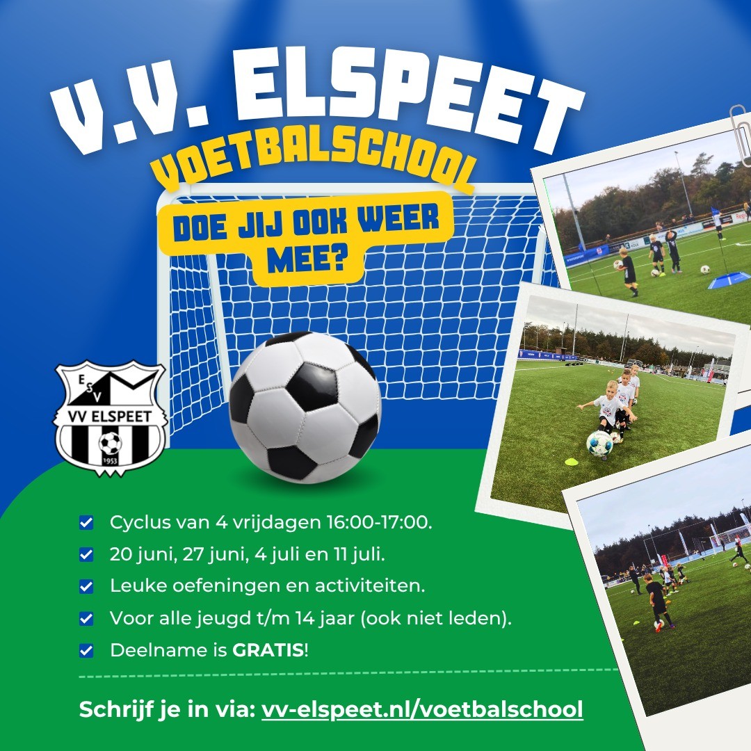 ELSPEET – Vier vrijdagen vol plezier en leuke voetbaloefeningen. Het is voor alle jeugd t/m 14 jaar, leden en niet leden. Dus neem al je vrienden en vriendinnen mee! Deelname aan de Voetbalschool is gratis voor iedereen!