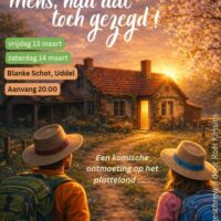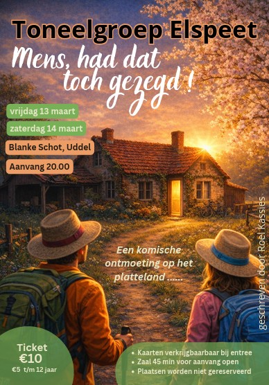 ELSPEET – Ook dit jaar brengt Toneelgroep Elspeet weer een vrolijke komedie op de planken. In “Mens had dat toch gezegd” besluiten de vrijgezelle broers Evert en Seine hun huis open te stellen voor wandelaars. Dat levert kleurrijke bezoekers, onverwachte situaties en een hoop misverstanden op. Als er ook nog eens een kostbaar voorwerp verdwijnt, raken de broers verwikkeld in hilarische chaos.