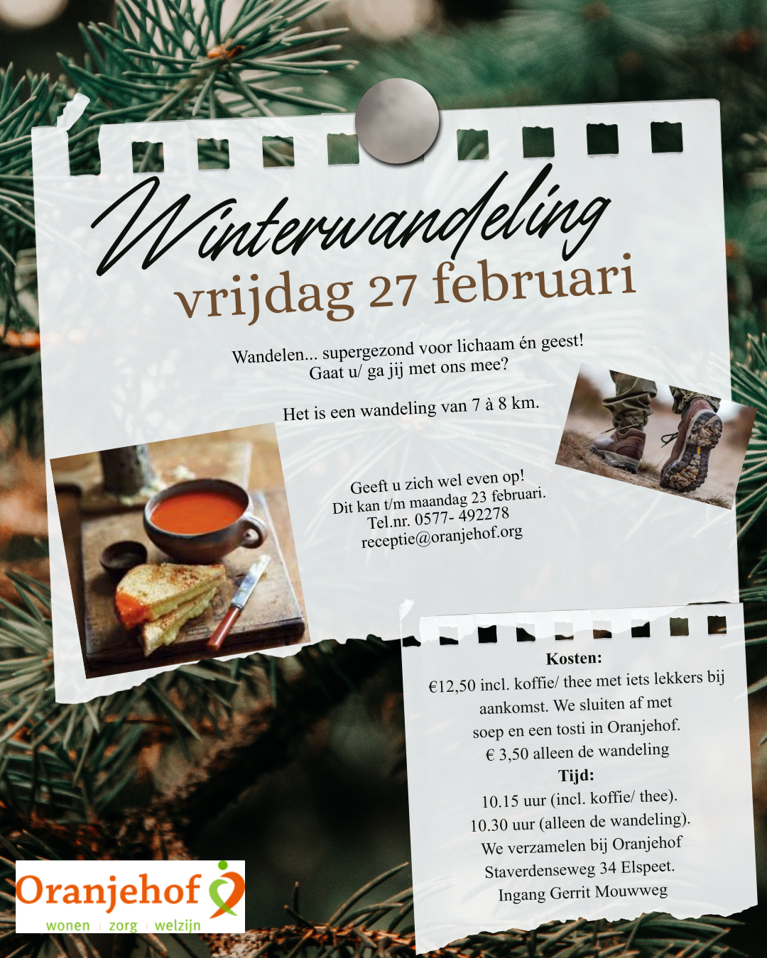 ELSPEET – Vrijdag 27 februari Winterwandeling van 7 á 8 kilometer! Loopt u/ loop jij met ons mee? Lees alle informatie op bijgaande flyer en vergeet u niet op te geven!