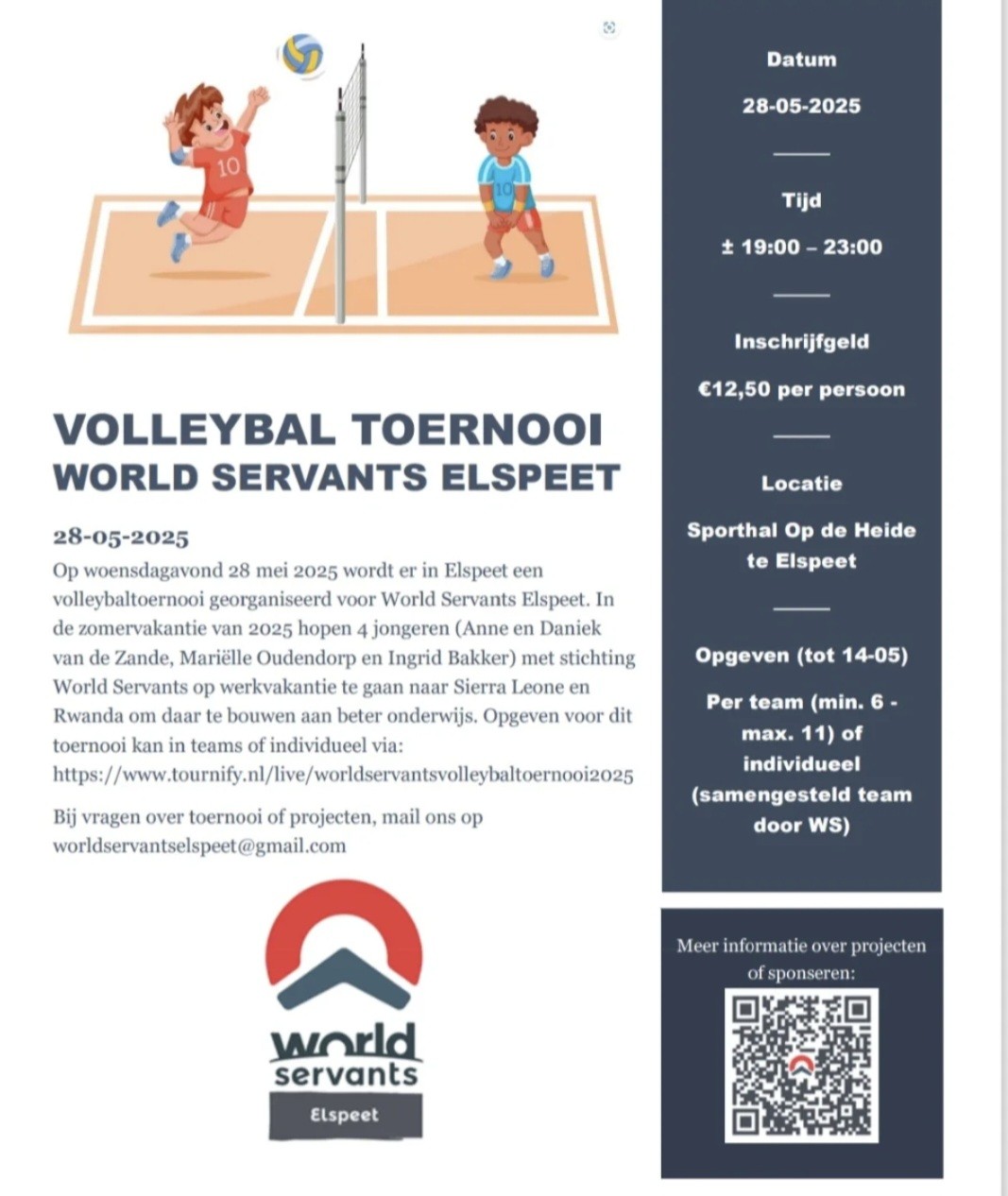 ELSPEET – Op woensdagavond 28 mei 2025 wordt er in Elspeet een volleybaltoernooi georganiseerd voor World Servants Elspeet. In de zomervakantie van 2025 hopen 4 jongeren (Anne en Daniek van de Zande, Mariëlle Oudendorp en Ingrid Bakker) met stichting World Servants op werkvakantie te gaan naar Sierra Leone en Rwanda om daar te bouwen aanbeter onderwijs. Opgeven voor dit toernooi kan in teams of individueel via: https://www.tournify.nl/live/worldservantsvolleybaltoernooi2025