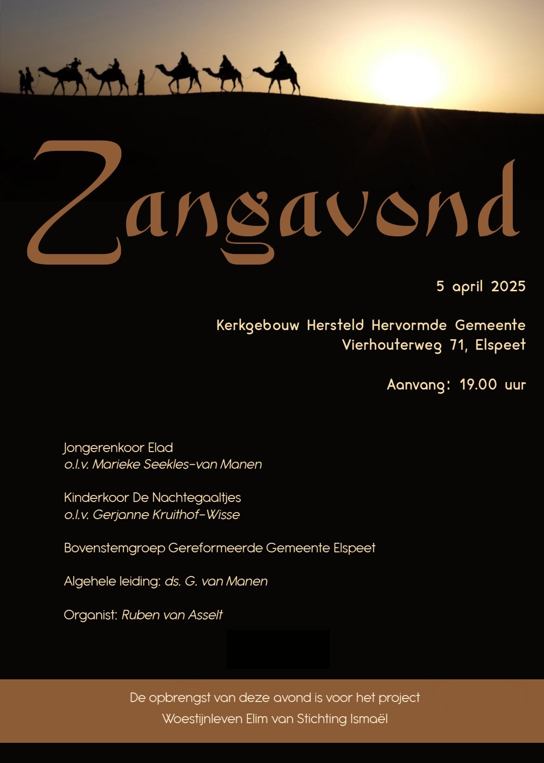 ELSPEET – D.V. zaterdag 5 april is er een zangavond in het kerkgebouw van de Hersteld Hervormde Gemeente in Elspeet. Jongerenkoor Elad, Kinderkoor de Nachtegaaltjes en Bovenstemgroep Gereformeerde Gemeente Elspeet zullen diverse gezangen laten horen. Dit alles onder begeleiding van organist Ruben van Asselt. De algehele leiding door Ds. G. van Manen. De opbrengst van deze avond is voor het project Woestijnleven Elim van Stichting Ismael.