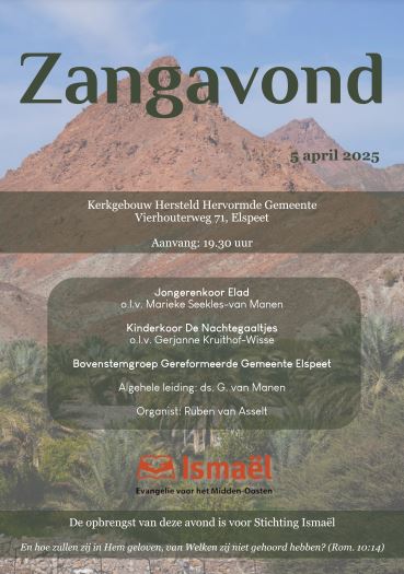 ELSPEET – In de kerk van de Hersteld Hervormde Gemeente in Elspeet wordt op D.V. 5 april 2025 een zangavond georganiseerd. Van harte welkom om te komen luisteren naar Jongerenkoor Elad, Kinderkoor ‘De Nachtegaaltjes’ en bovenstemgroep Gereformeerde Gemeente Elspeet. Algehele leiding van de avond ligt bij Ds. van Manen. De opbrengt van deze avond is voor Stichting Ismael.